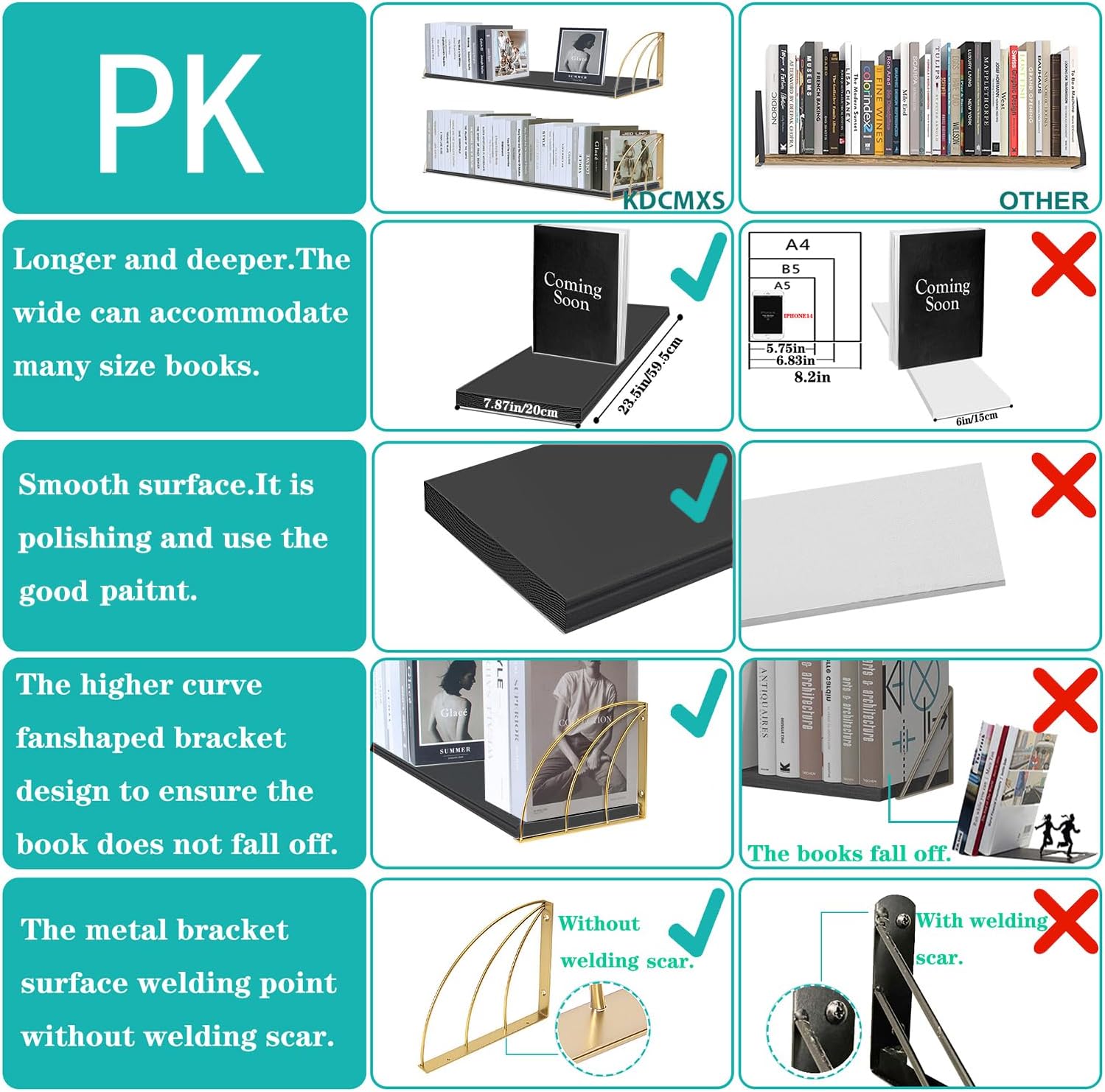 - Thick Floating Book Shelf -Thickness 18MM natural pine wood board.Classic line shape,can hold 70 LBS for a long time without deformation,the other is 15MM paulownia wood,pine wood is much stronger than paulownia wood.