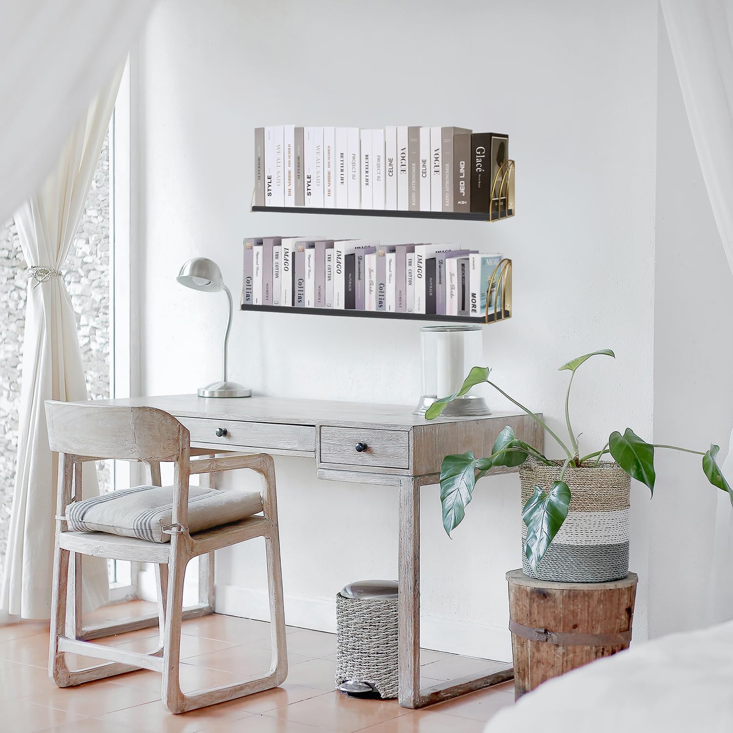 - Black Floating Shelves-The high curve fanshaped bracket design to ensure the book does not fall off.The Arc bracket of black gold shelf can block almost the entire surface of the book,while other triangular bracket can block only half the area of the 45-degree angle,and the book can easily fall off.