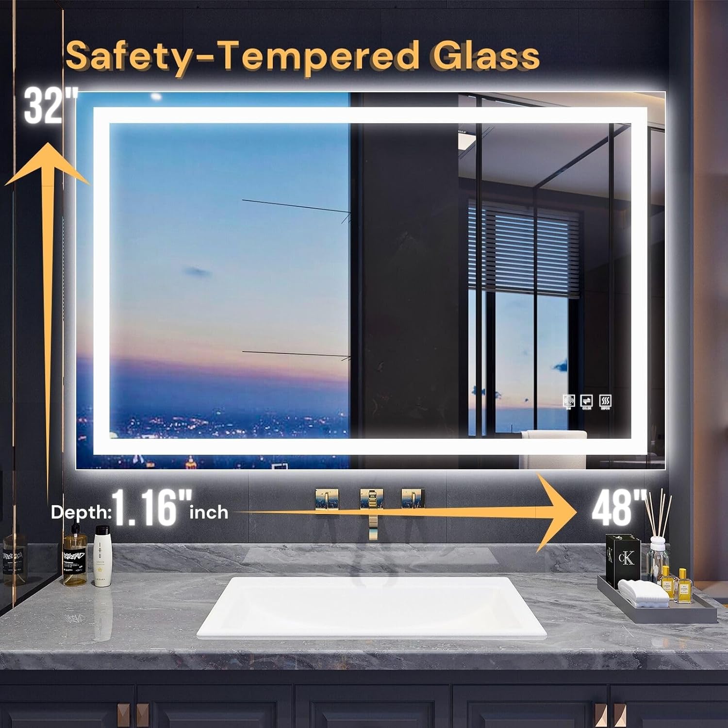 LED Bathroom Mirror 48"x 32",Front Lit and Backlit Bathroom Mirror with Lights,Stepless Dimmable,Anti-Fog, Shatter-Proof, Memory, 3 Colors Lighted Vanity Mirror (Horizontal/Vertical)