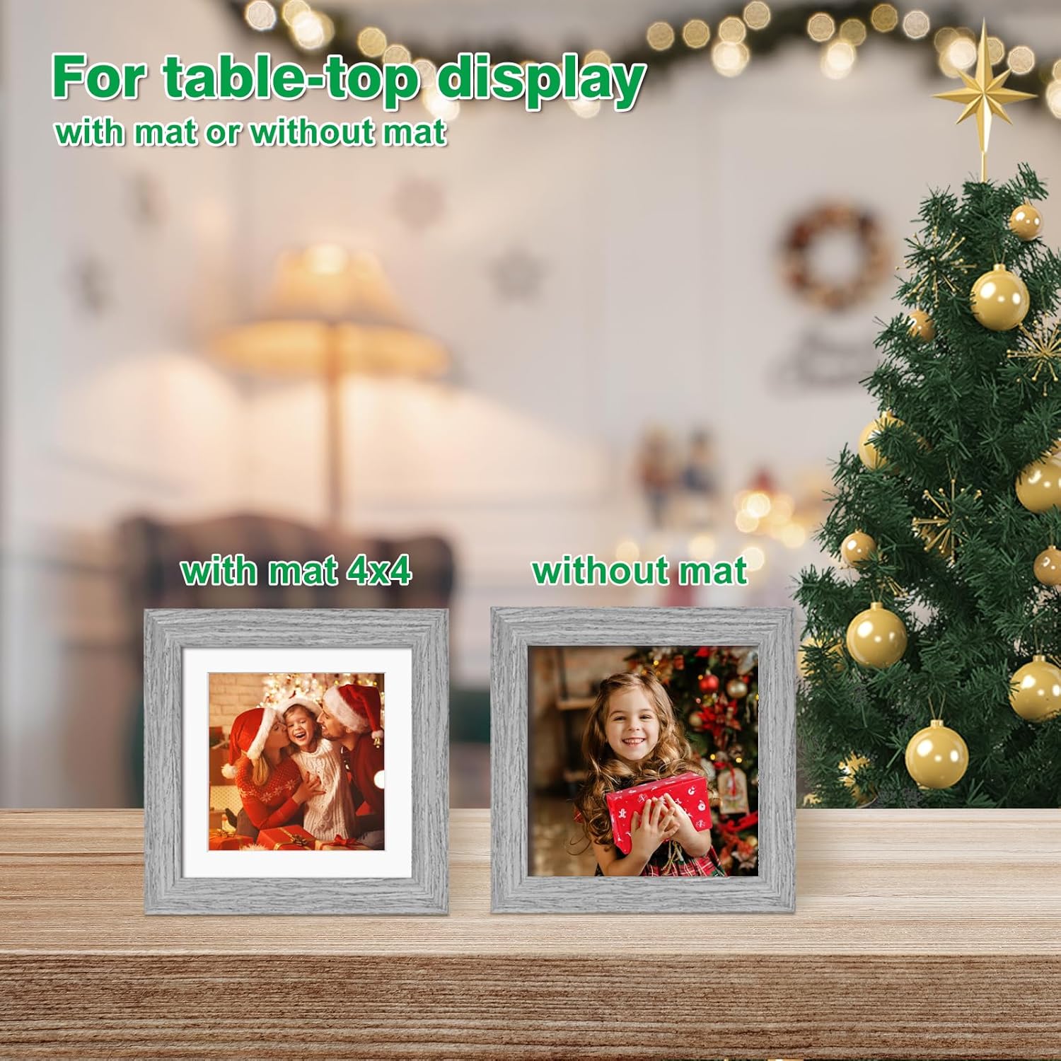 KINLINK 5x5 Picture Frame, Grey Square Solid Wood Frames for Pictures 4x4 with Mat or 5x5 without Mat, Wall and Tabletop Display Photo Frames Grey Wood 4 Pack