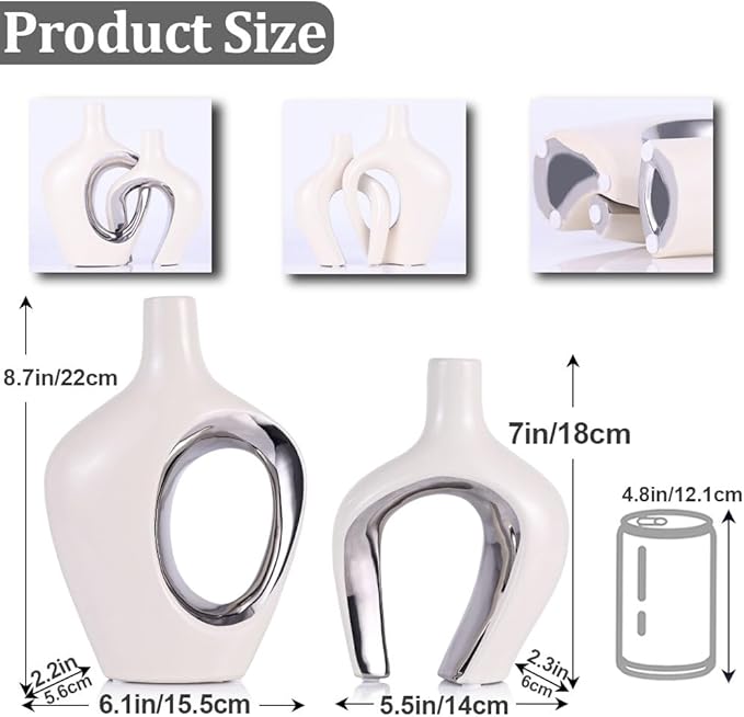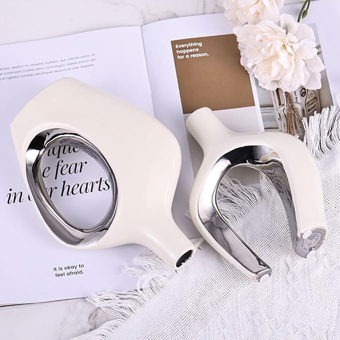 - Elegant Design: This exquisite white and silver vase set features two distinct pieces that intertwine gracefully, forming a harmonious and artistic ensemble. Their sleek curves merge into a captivating visual interplay, enchanting any observer and elevating the aesthetic of any room, making them perfect as white and silver ceramic vases for home decor or as elegant table centerpieces