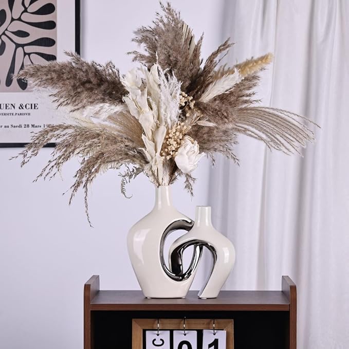 - Texture & Craftsmanship: Crafted with precision and kiln-fired at 1300 degrees, these vases boast lasting durability with an elegant white and silver electroplated finish. The radiant surfaces beautifully reflect light, enhancing the display of pampas grass, dried flowers, and greenery, adding a contemporary and sophisticated touch to any setting.
