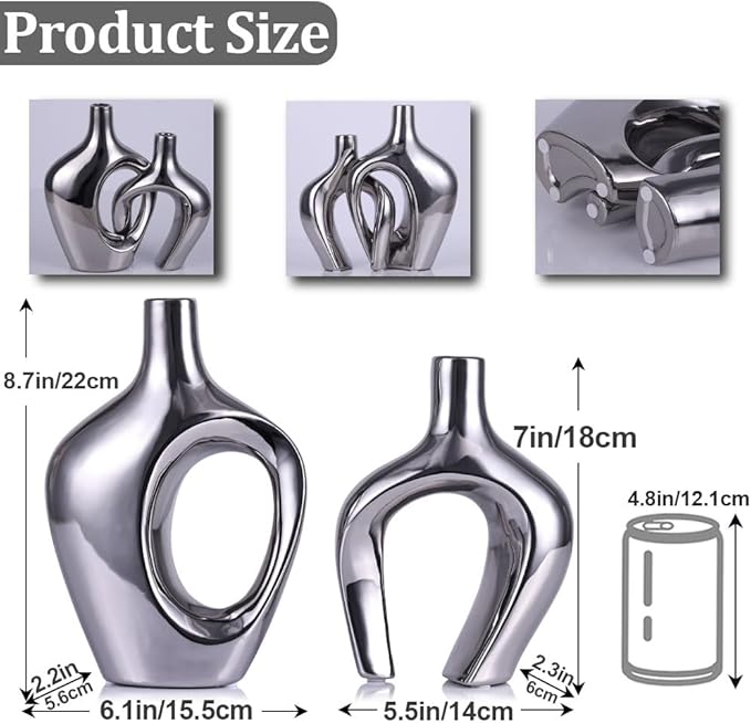 - Silver vases for centerpieces: The exquisite silver vase set includes two separate pieces that intertwine gracefully, creating a symphony of art and harmony. Their merged sleek curves produce a captivating visual interplay, enchanting observers and uplifting the aesthetic of any space, perfect as silver ceramic vases for home decor or as table centerpieces.