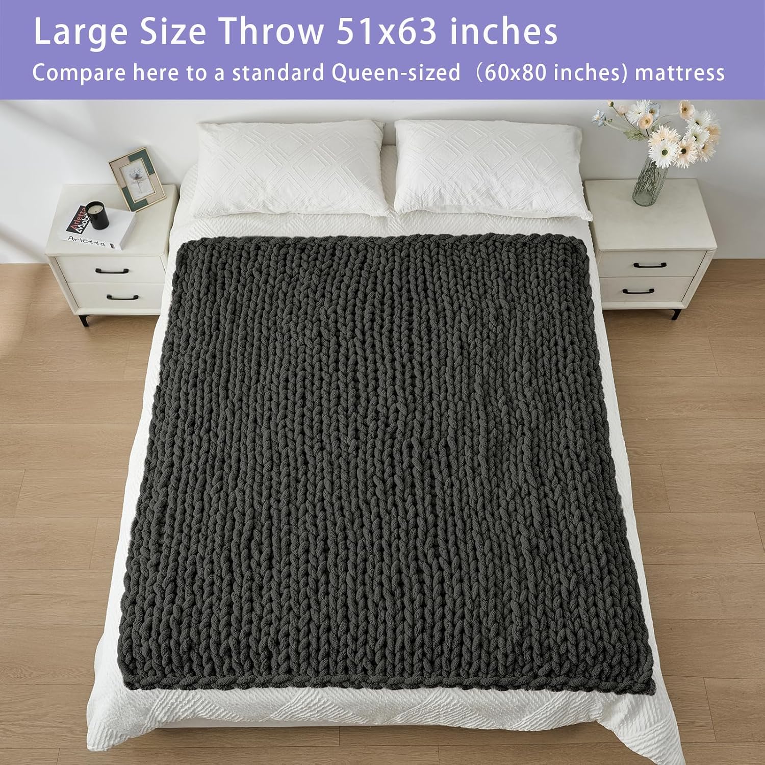 Bigacogo Chunky Knit Throw Blanket for Couch, 51x63 inches, 100% Hand Knitted with Thick Jumbo Chenille Yarn, Cozy Soft Large Rope Knot Cable Crochet Blankets for Sofa Bed Living Room, Dark Grey