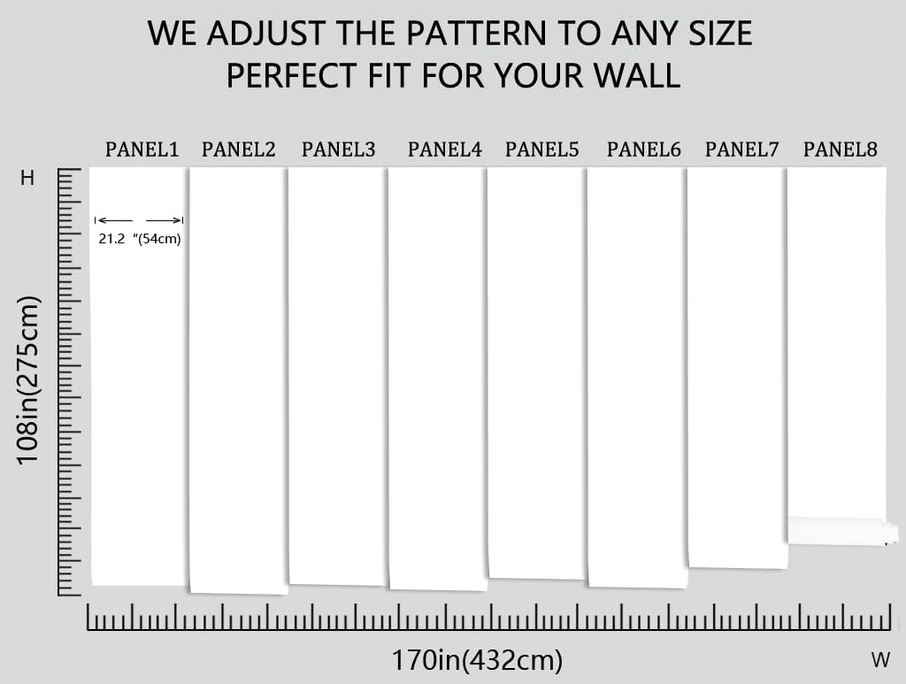 - Our mural is 108 inches tall and 170 inches wide, and to make it easier to transport over long distances, we have divided the width into 8 panels of 21.2 inches each, with a numerical serial number under each section to make installation easier!