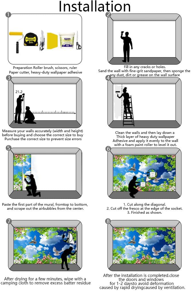 - Installation steps 1. Fill in any cracks or holes and clean the surface of the wall of dust, dirt and grease.2. Apply heavy-duty wallpaper paste to the wall, not the mural.3. Mark the position of each strip of wallpaper with a spirit level.4. Align the pattern and slide it into place.5. Scrape the bubbles with a spatula.6. Let it dry for a couple of minutes and it's ready to go!