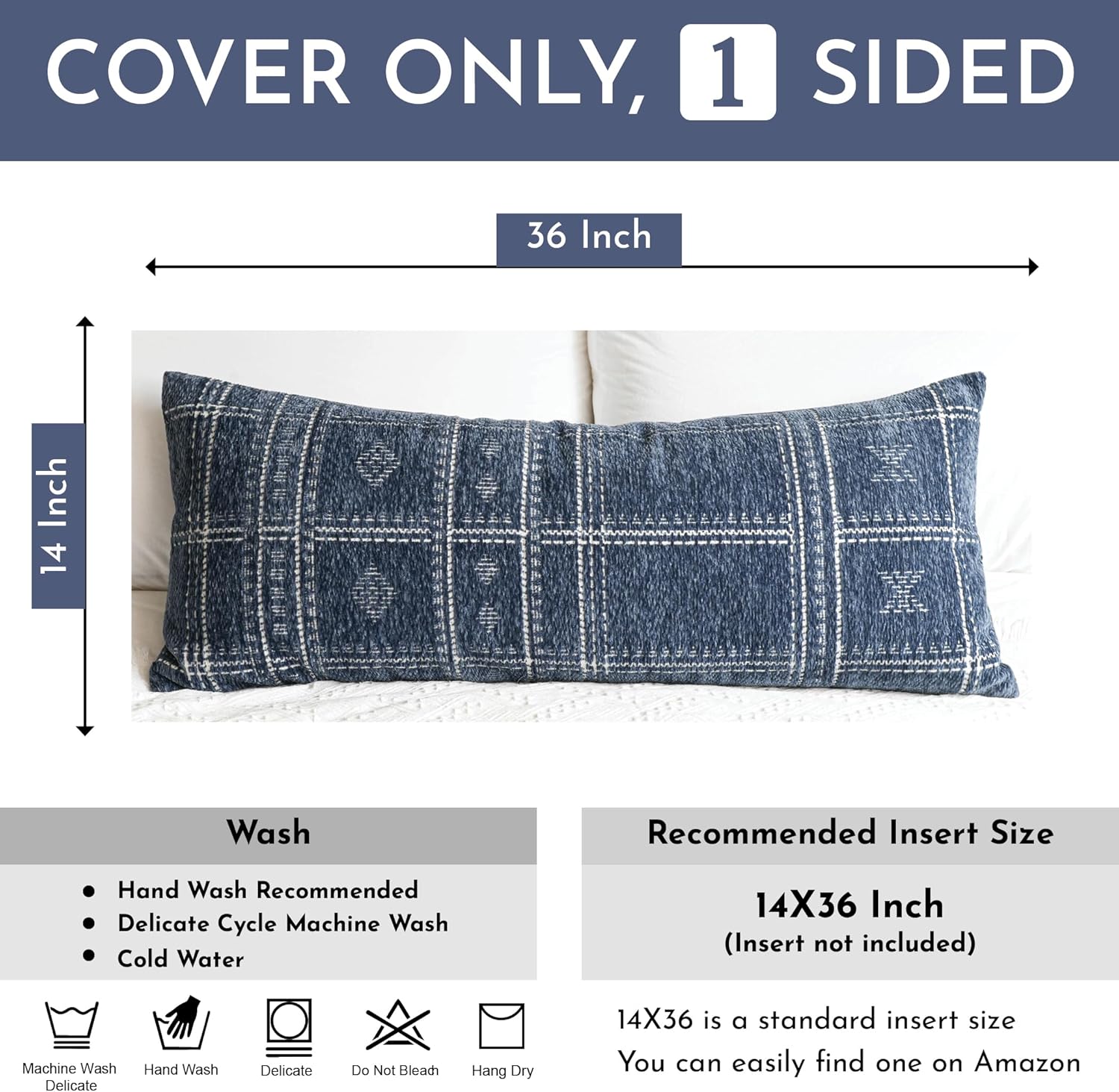 BlissBlush Dark Blue Boho Lumbar Throw Pillow Cover 14X36, Decorative Long Accent Body Pillow for Bed, Farmhouse Woven Textured Pillowcase for Couch (Cover ONLY)
