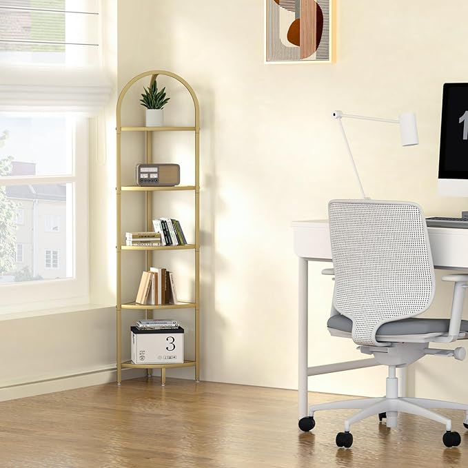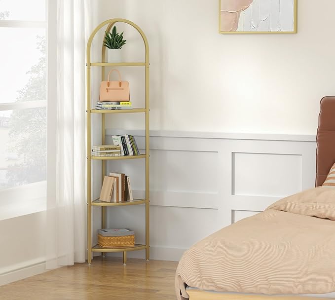 - Stylish and Functional: This 5-tier Steel Frame and glass Corner Shelf with a gold finish is great for adding a touch of elegance to your home decor, while also providing ample storage and display space for your books, photos, plants, and other items. The arched design makes it a beautiful addition to any room