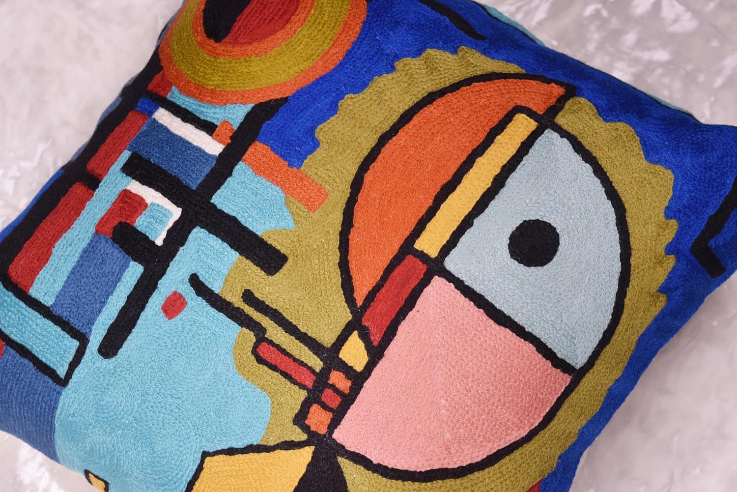 - ❤ Modern Throw Pillow Cover - Hand Embroidered: Our vibrant decorative abstract pillow covers draw inspiration from Kandinsky's artistry and are meticulously hand-embroidered using soft wool. Our skilled artisans devote painstaking attention to detail, creating an extraordinary abstract contemporary pillow that enhances your home decor. An up-close look at this contemporary accent pillow reveals the exquisite craftsmanship of fine chain-stitch hand embroidery.