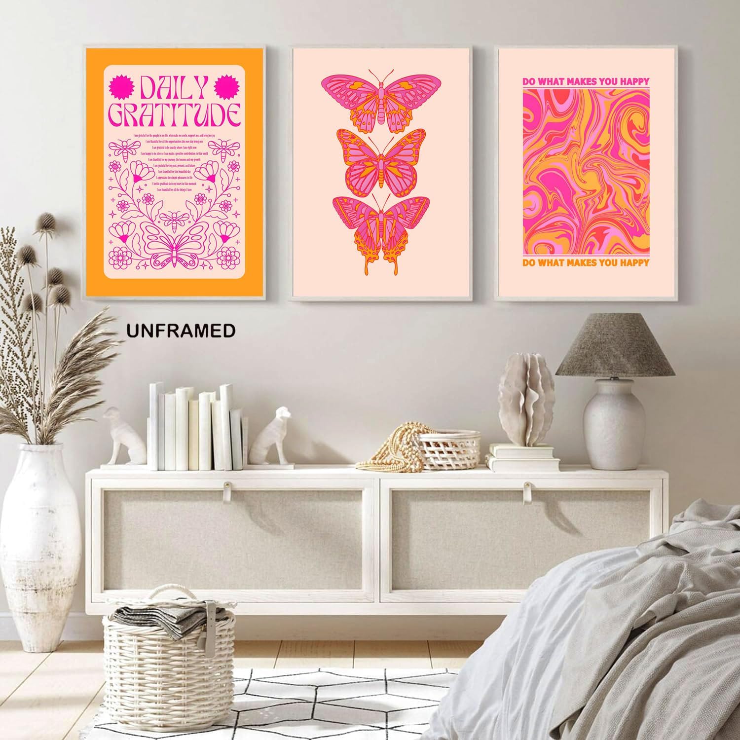 Hwetui Butterfly Wall Art Poster Set of 3 - Pink Orange Preppy Wall Decor Pictures, Daily Gratitude Paintings Prints Aesthetic Home Decor for Girls Bedroom Dorm Apartment 12x16 inch Unframed