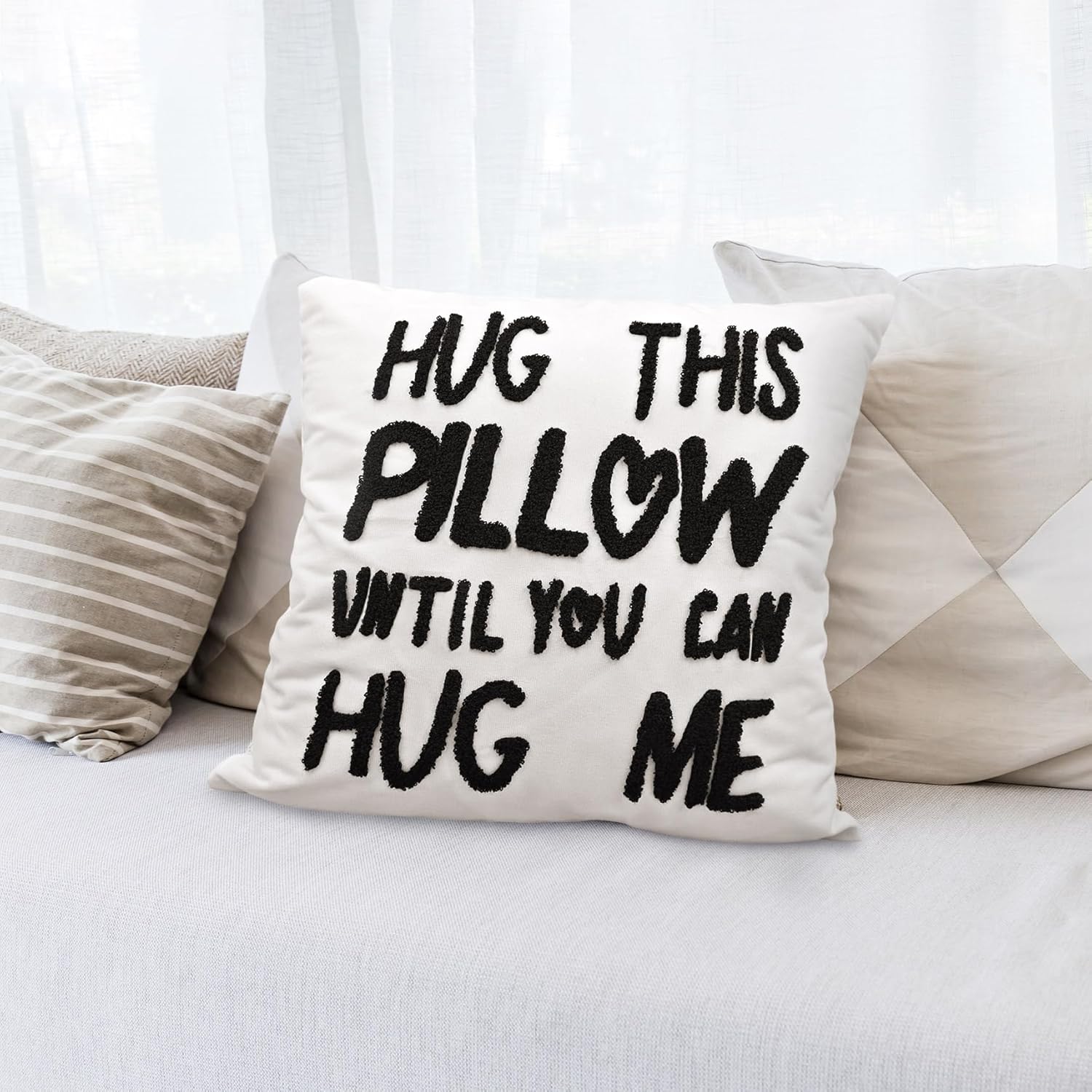 Hug This Pillow Until You Can Hug Me Throw Pillow Covers Decor for Home Bedroom, 18'' x 18'' Embroidery Pillow Case, Boyfriend Girlfriend Birthday Gifts,Long Distance Relationships Gifts (white)