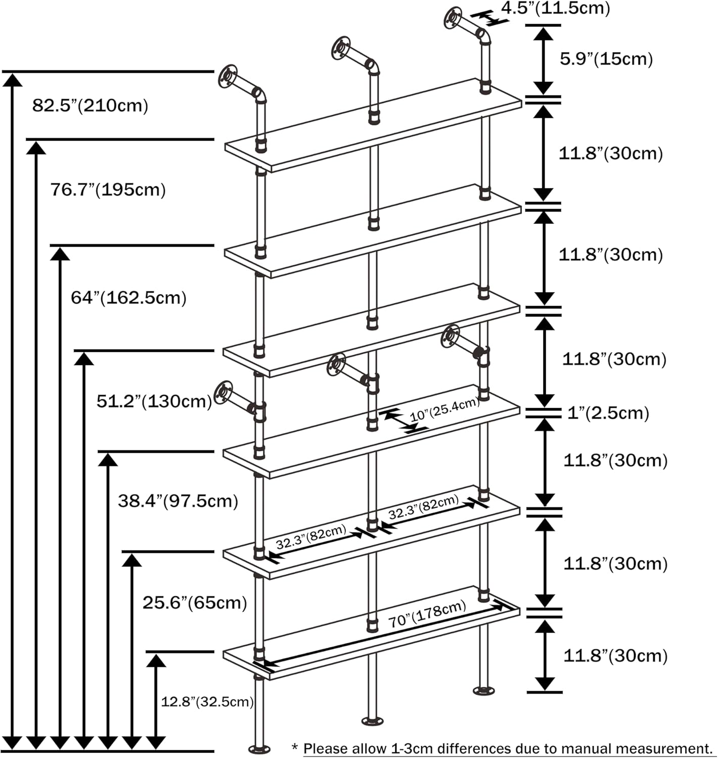 - πππππ ππππππποΌFully assembled dimensions: 10" D x 70" W x 82.5" H. Length between shelves: 11.8 inches. Length between iron pipes: 32.3 inches. Constructed with high-quality durable π¬π¨π₯π’π π©π’π§ππ°π¨π¨π(Not MDF, or Plywood, or particle board) and sturdy metal pipes.