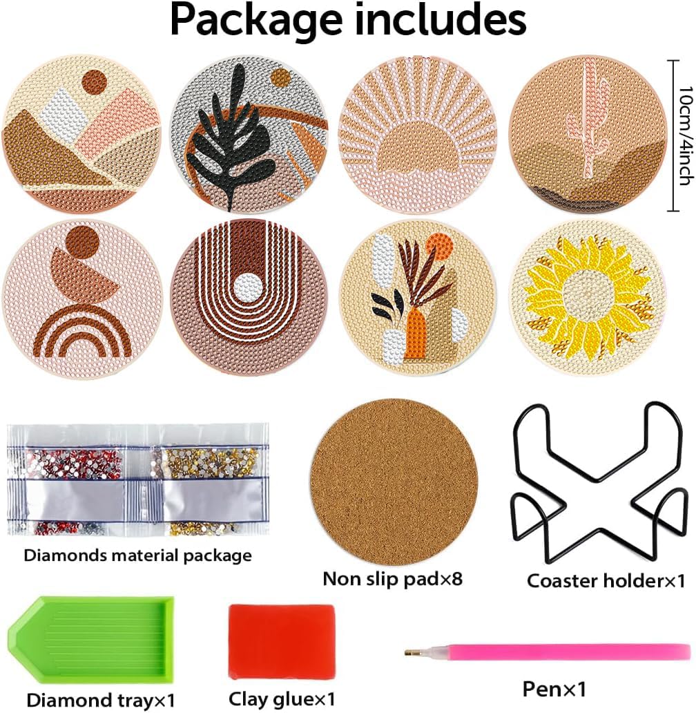 - Complete DIY Experience: Unleash your creativity with our diamond art kits for adults. Each kit contains 8 beautifully designed coasters, vibrant diamonds, and essential tool set. The tool set includes a diamond painting pen, clay glue, and a diamond tray, providing everything needed for an immersive crafting process