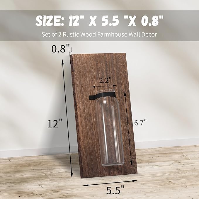 - RUSTIC WOOD FARMHOUSE WALL DECOR: The package includes 2 pack wood wall glass vases and 2 string lights. Our wall-hanging wood wall planter is thoughtfully designed to be both functional and visually appealing. The floating design gives it a natural and rustic look, allowing it to blend seamlessly into any room wall decor. They are perfect for a space that needs to be topped off with some gorgeous simplicity, like wood tones and greenery!