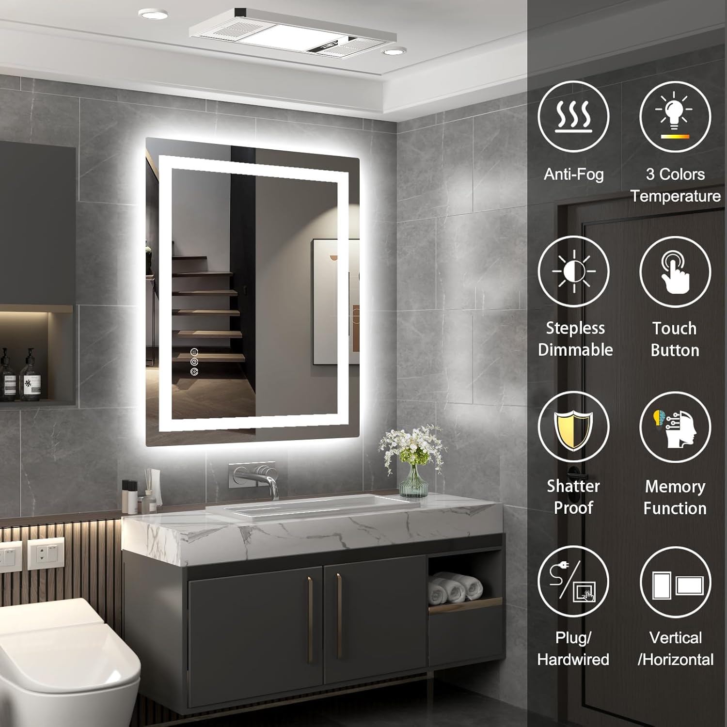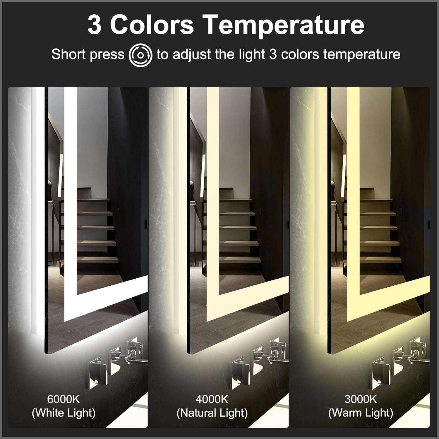 - 【3 Colors Adjustable & Dimmable & Memory Function】 Dimmable lighted mirrors for bathroom wall with 3 touch buttons. Long press the touch switch to adjust the 20%-100% brightness. Short press the light button to adjust 3 color temperature, 3000-6000K (warm light, natural light, white light). Only set one time, memory function can remember your personal setting for the smart LED mirror you last used.