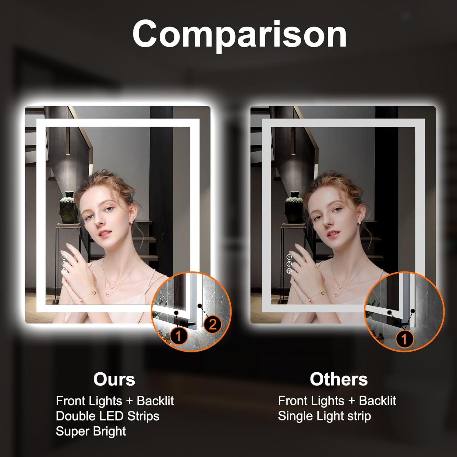 - 【Front and Backlit LED Mirror with Double LED Strips】 Twalsu LED bathroom mirror with lights bright two LED strips on both front and back, front and backlit mirror is brighter and clearer more than other LED bathroom vanity mirror, which only has front light or Backlit lighted. The lighted vanity mirror lighting are super bright without dark and bring enough lights for your makeup or grooming, has a better washing experience.