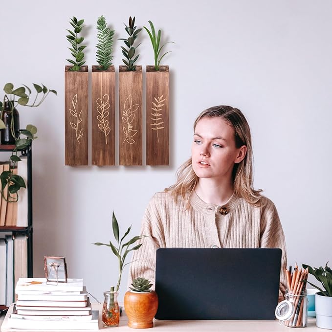 - PERFECT DECORATIVE SIZE - Each plant wall shelf measures 11.8 inches high x 2.8 inches wide and 1.6 inches thick. Made by hand so each piece is slightly different and each one is unique. (Note: Note: The package does not include the fake flowers shown in the picture, it only includes 4 wooden vases)