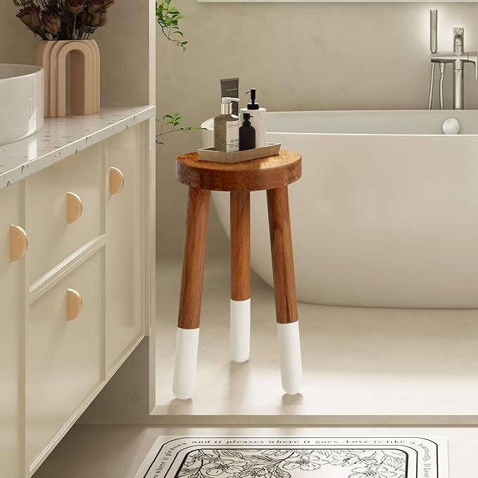 - ✨ A TIMELESS, CLASSIC, WOODEN STOOL: Handcrafted from Natural Teak Wood, sealed to perfection, and legs dipped in white to add a fun dimension. Perch your houseplants on them, the kid's stack of books, or your hand towels in the bathroom, and let it be the finishing touch to any room in your humble abode.