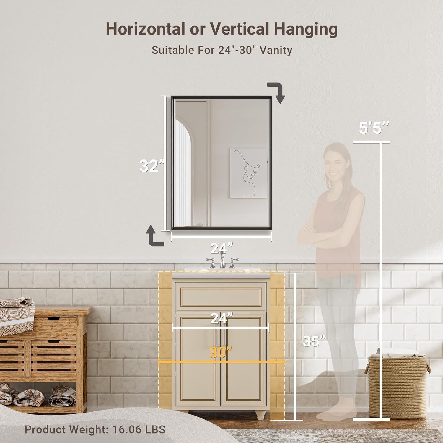 Black Framed Mirror for Bathroom, 24x32 Inch Black Rectangle Beveled Bathroom Vanity Mirror, Anti-Rust Matte Black Metal Frame Mirror for Wall, Vertical/Horizontal Wall-Mounted Mirrors