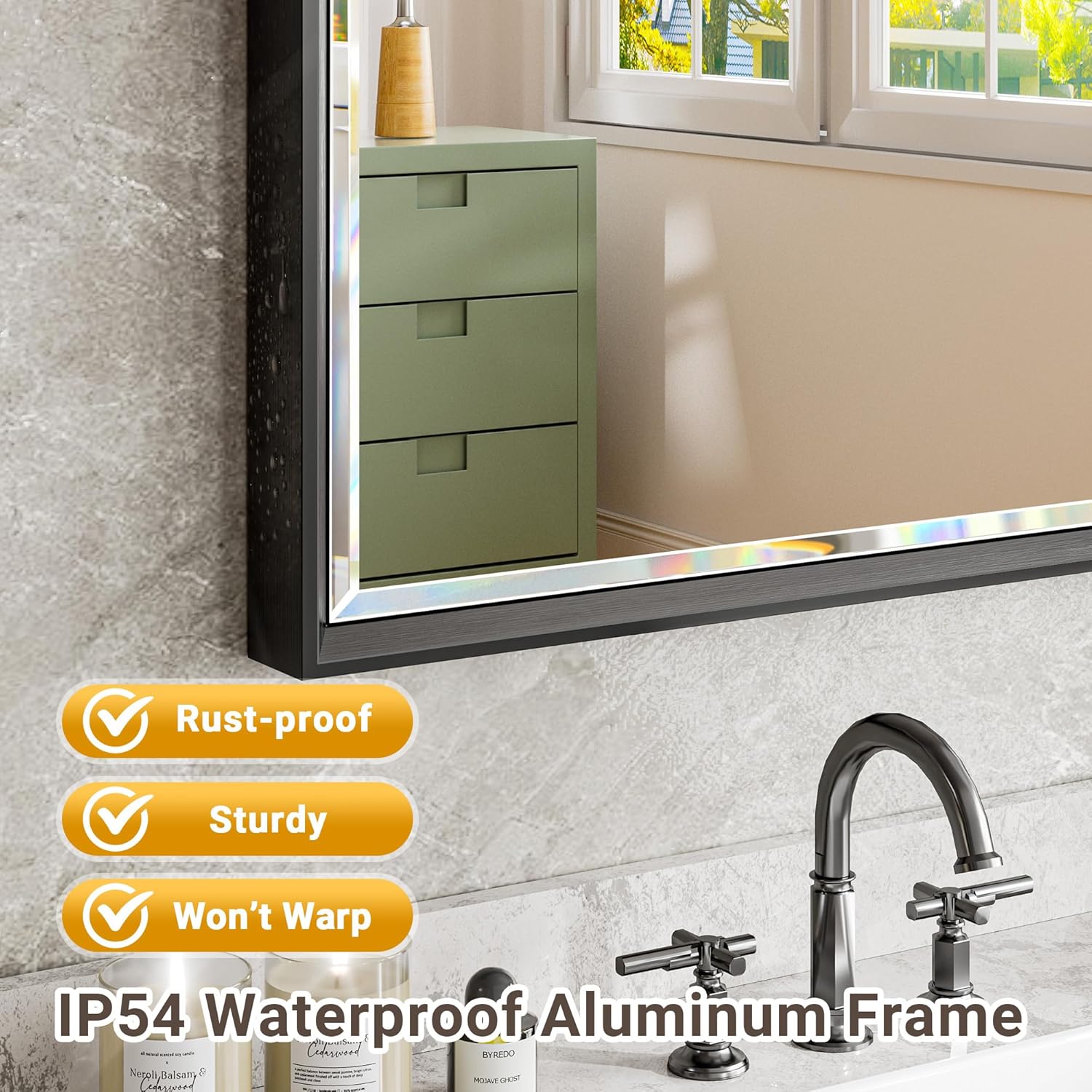 - ✔【Premium Material, Long Lifespan】Made of 3rd gener. eco-friendly mirror, provides a clear and 100% faithful reflection of real image without distortion. The mirror top treatment preventing any black spots or detachment even with prolonged use. Adopts thick aluminium alloy frame with IP54 anodized rating, adds double-layer corner code structure to strengthen the frame hardness. The overall frame has high strength and will not deform, while also protecting the mirror from damage.