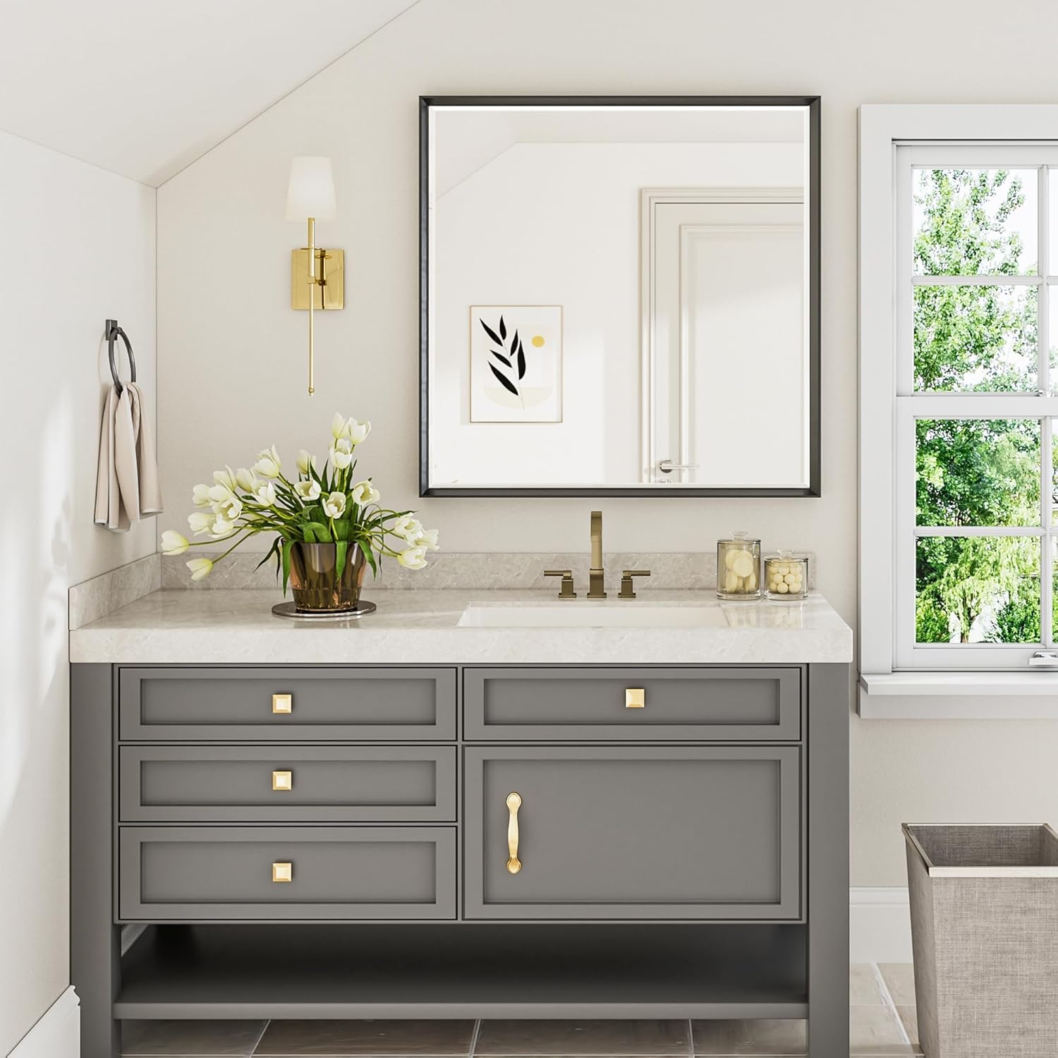 Black Framed Mirror for Bathroom 36x36 Inch Square Beveled Bathroom Mirror, Matte Black Metal Frame Bathroom Mirror, Shatterproof Black Mirror for Bathroom Wall