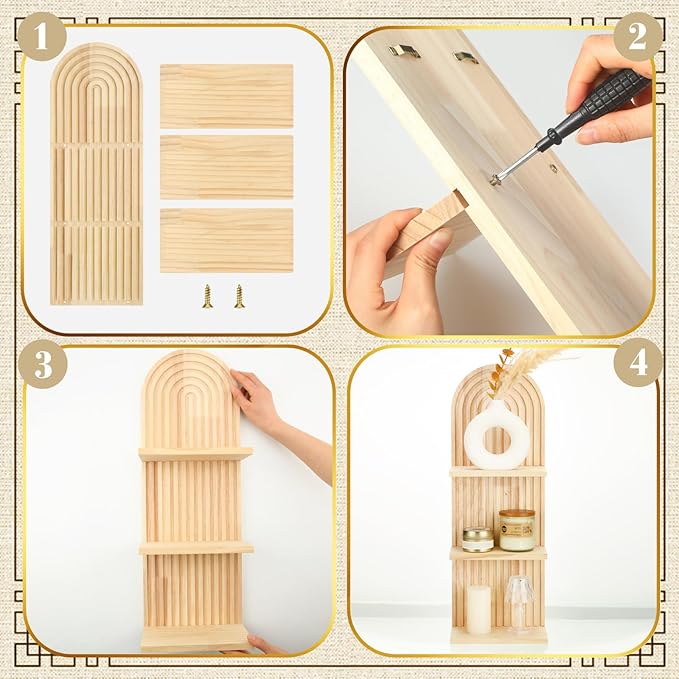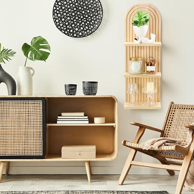 - Retro Arch Design: the wood wall shelf features in an arch style, like a rainbow, plain and delicate, the 3 tire design allows you to store personal belongings, such as figurines, crystal decorations, ornaments, picture frames, souvenirs, small vases, etc., to decorate your space