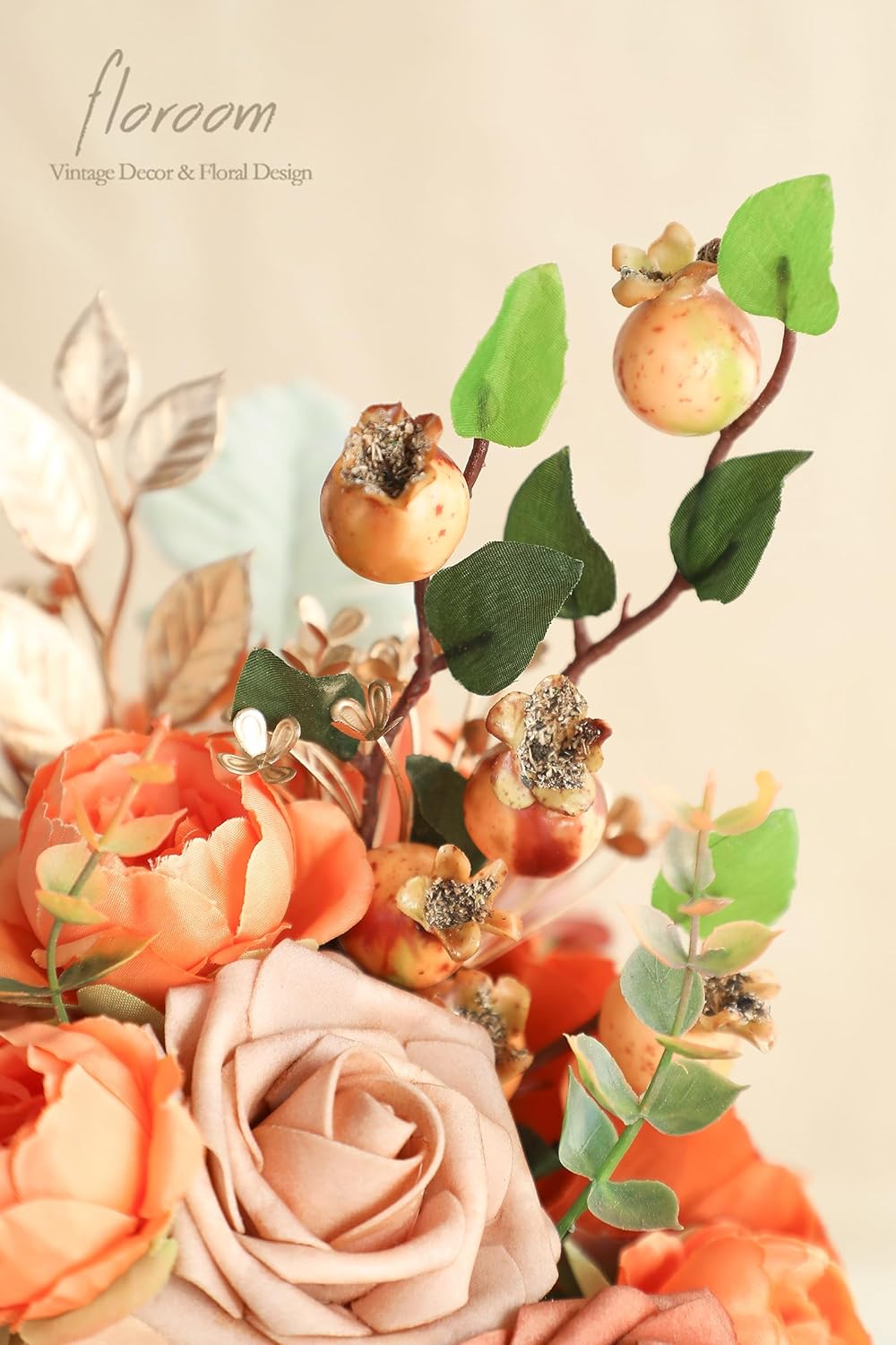 - ❤️ What You Get: Includes lifelike artificial peach roses, berry branches, eucalyptus leaves, gold-painted leaves, and more.