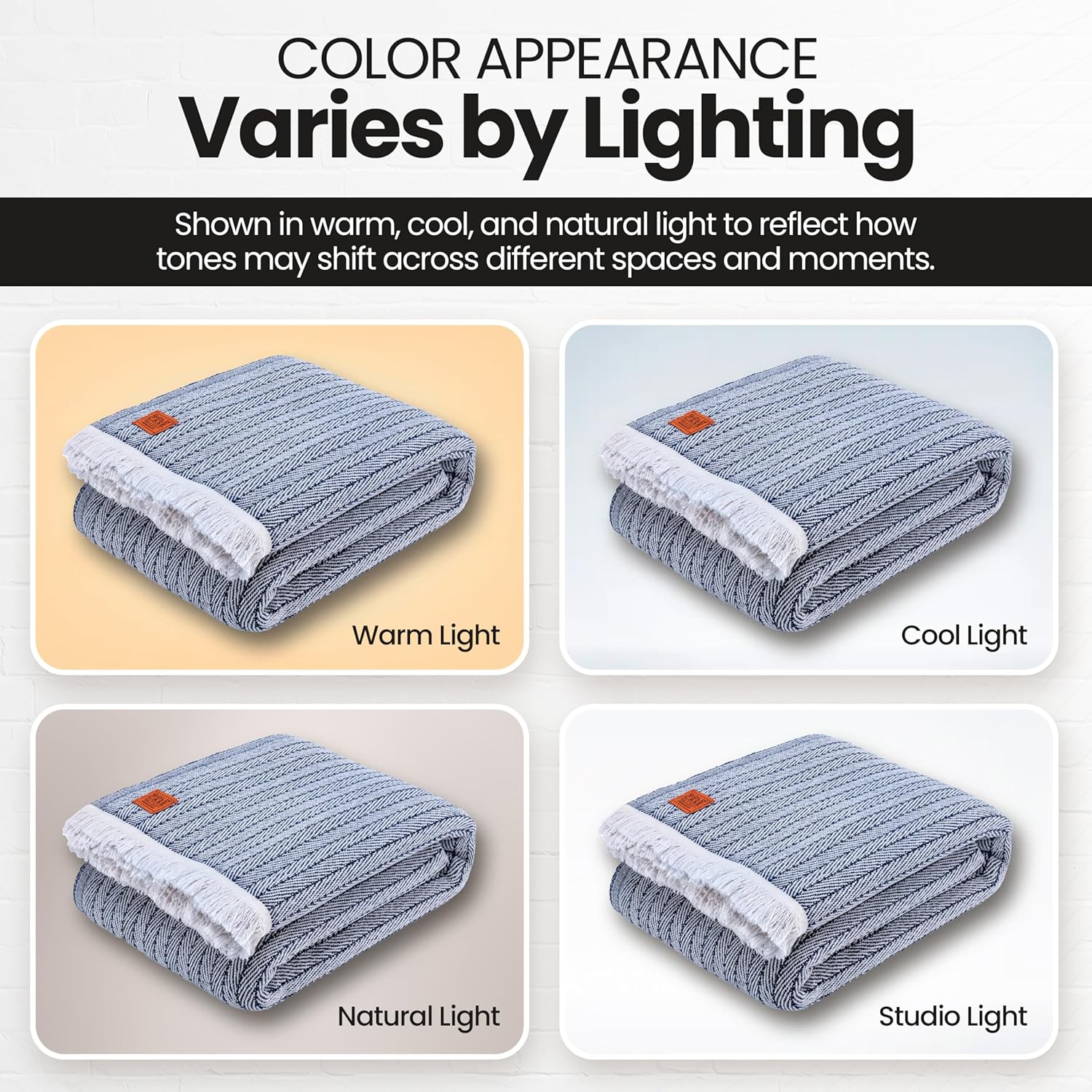 - CELEBRATE SUSTAINABLE STYLE: This 100% recycled cotton throw blanket is made in Turkiye, and it is a commitment to a greener planet; embrace our light blanket with rustic farmhouse charm, complete with a unique natural fringe design