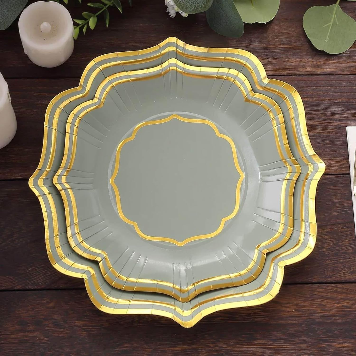 - 25 Pack of 8 Inch Plates: Crafted with a soft sage green finish and detailed with a gold scalloped rim, these 300gsm premium paper plates are perfect for desserts, appetizers, or salads at weddings, showers, and garden parties.