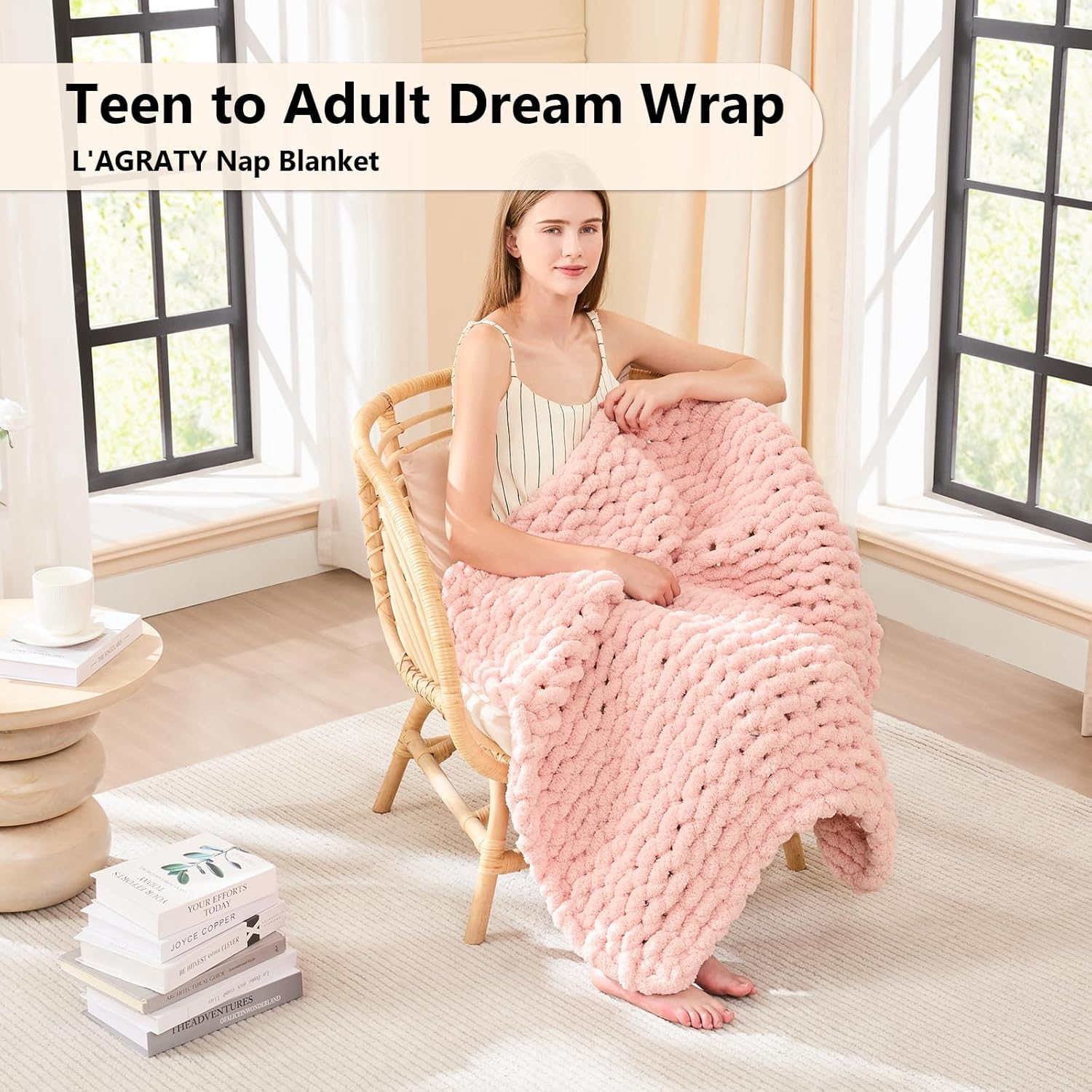 L'AGRATY Chunky Knit Blanket Throw - Soft Chenille Yarn Throw Blankets 30x40:Handmade Thick Cable Knit Crochet Blanket - Large Knit Chunky Rope Knot Throw Blankets for Couch Sofa Bed Home Decor