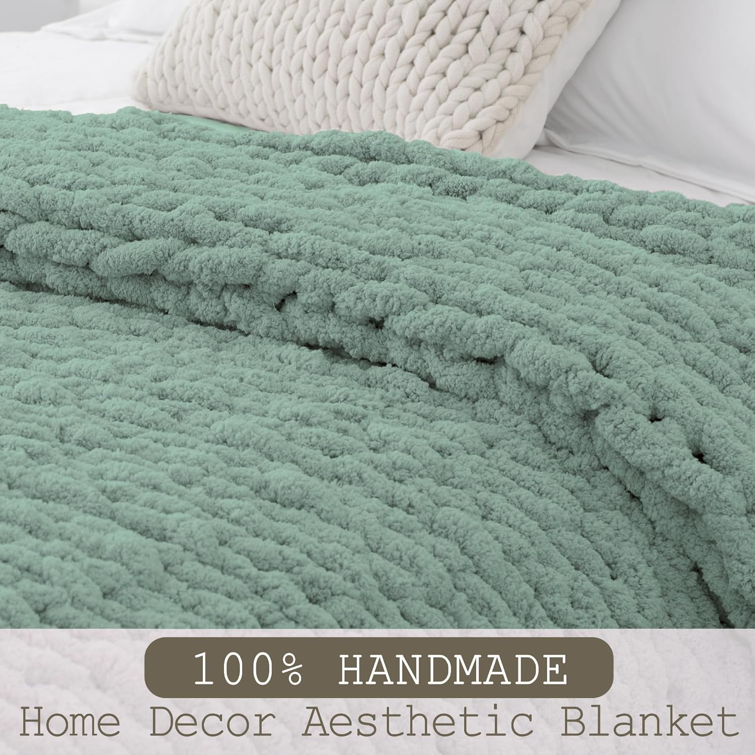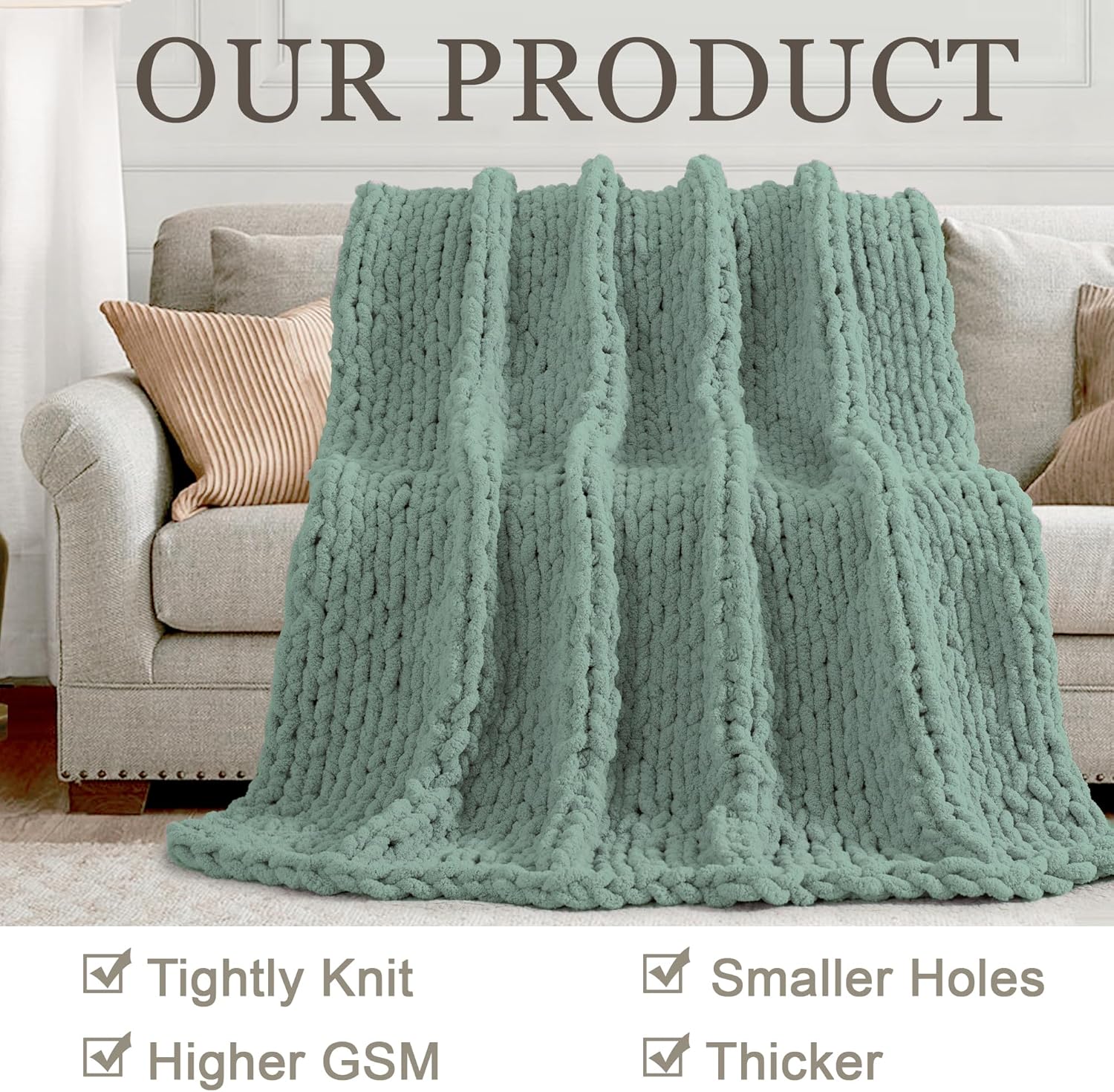 Chunky Knit Throw Blanket 60"X 80", 100% Handmade with Soft Chenille Yarn, 6.7lbs Thick Cable Knitted Blankets, Large Rope Knot Crochet Throws for Couch Sofa Bed Home Decor, Sage Green