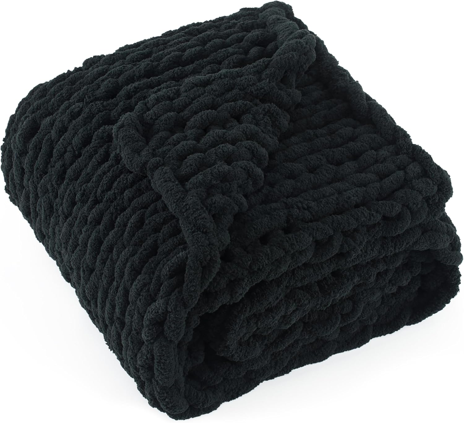 Chunky Knit Throw Blanket 60"X 80", 100% Handmade with Soft Chenille Yarn, 6.7lbs Thick Cable Knitted Blankets, Large Rope Knot Crochet Throws for Couch Sofa Bed Home Decor, Black