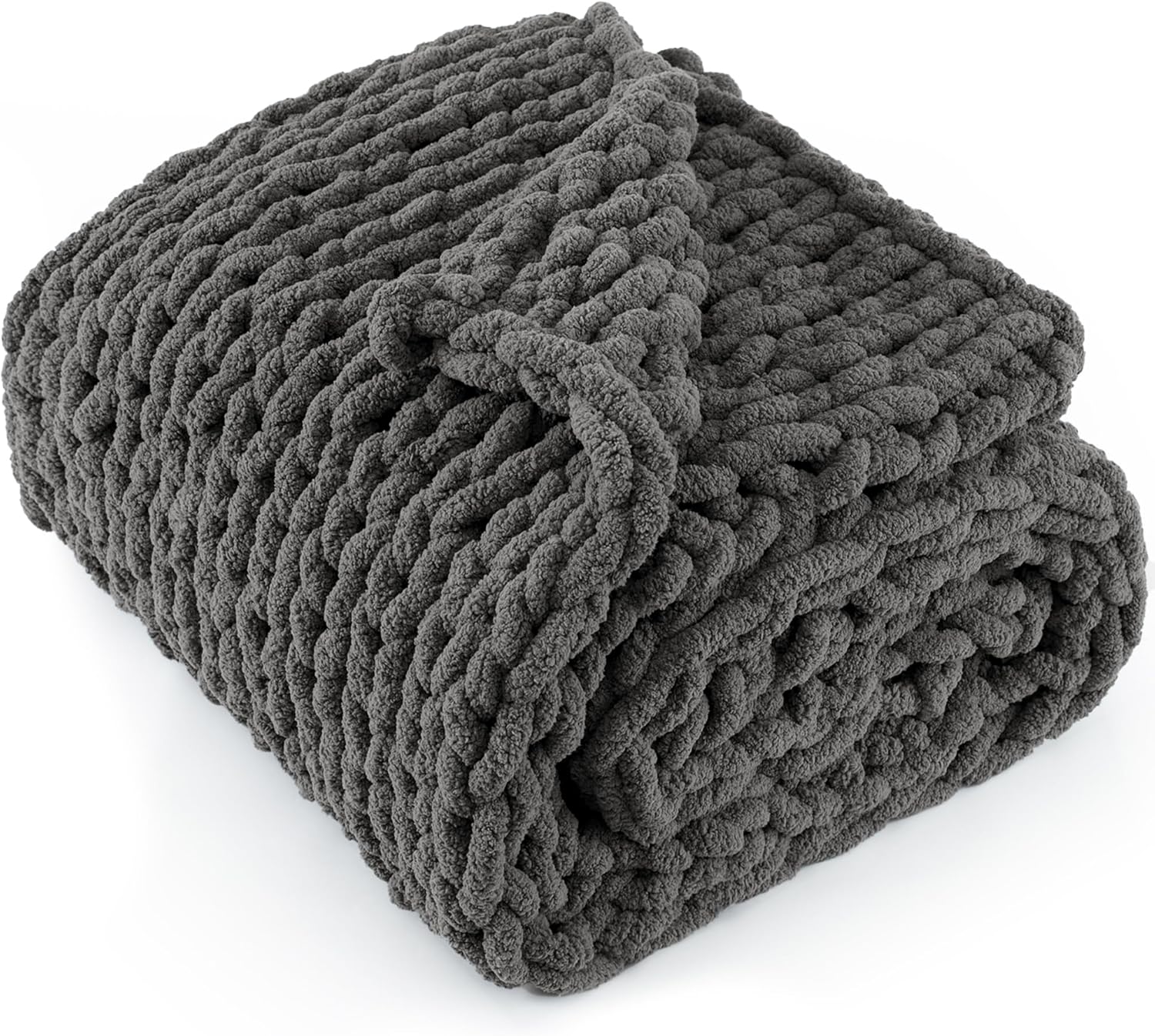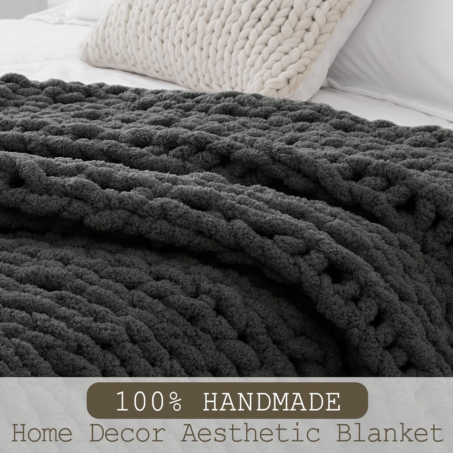 Chunky Knit Throw Blanket 60"X 80", 100% Handmade with Soft Chenille Yarn, 6.7lbs Thick Cable Knitted Blankets, Large Rope Knot Crochet Throws for Couch Sofa Bed Home Decor, Dark Grey