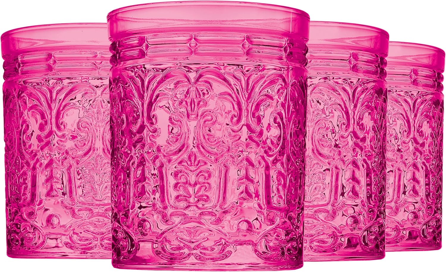 Godinger Old Fashioned Whiskey Glasses, Drinking Glasses, Vintage Decor, Glass Cups, Water Glasses, Cocktail Glasses - Jax Collection, 12oz, Hot Pink, Set of 4