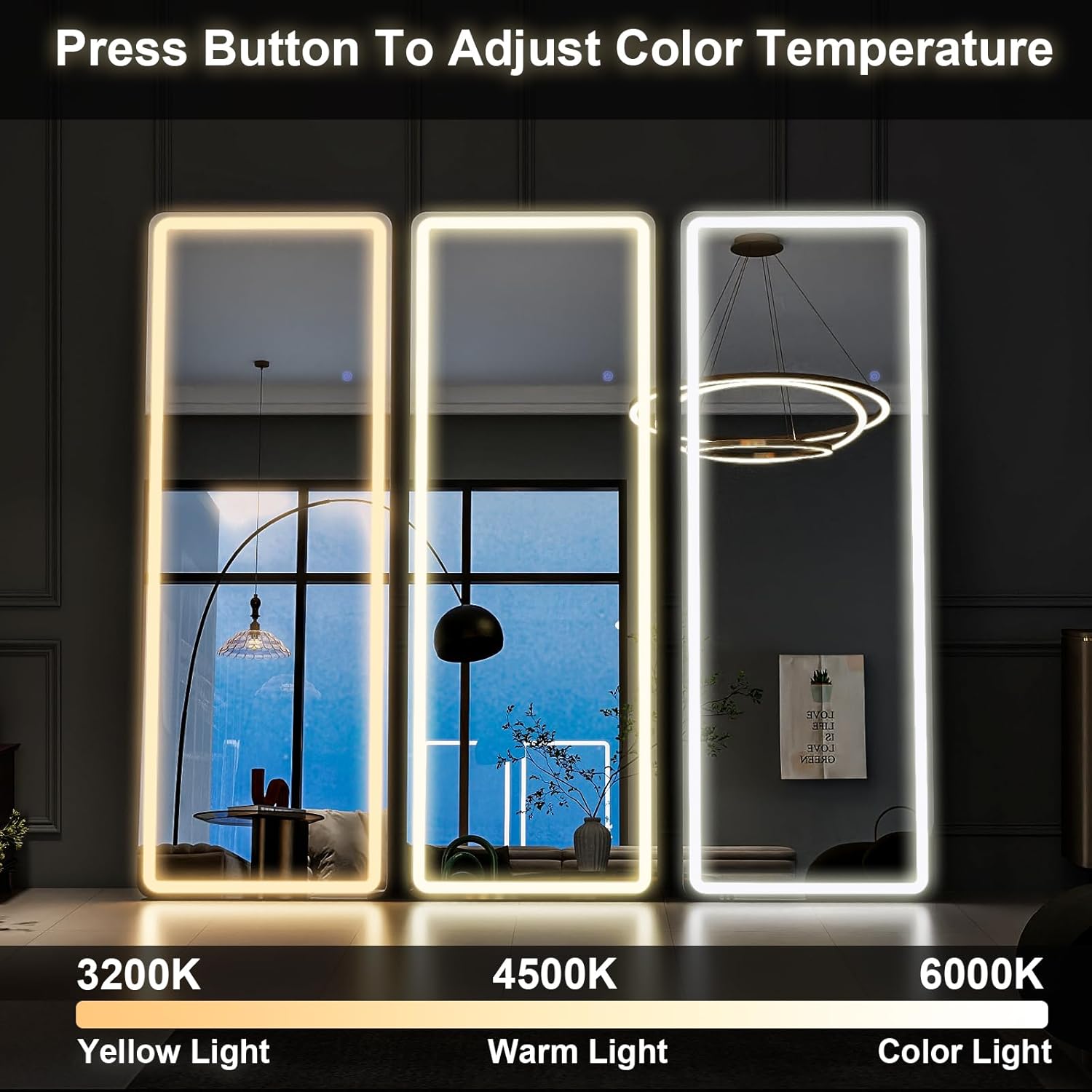 - Touch Buttons & Smart Dimming - This lighted full body mirror has three colors of light, warm/white/natural light. This floor mirror is designed with touch switch, single touch can switch or adjust the light color. A good standing full body mirror can enhance your life