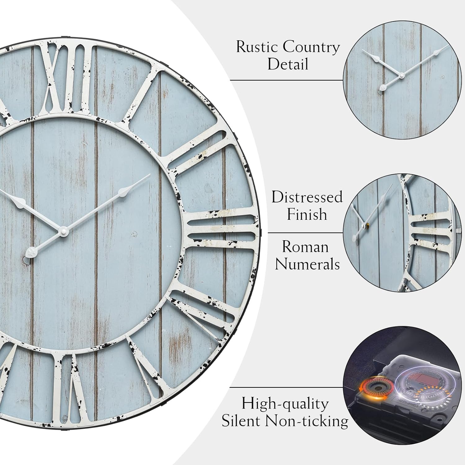 - Stunning Design: EMAX HOME Large Farmhouse Wall Clock boasts a vintage look with its beautiful blue wooden texture. The minimalist Roman numerals add an elegant and timeless touch, making it a perfect decor piece for any room.
