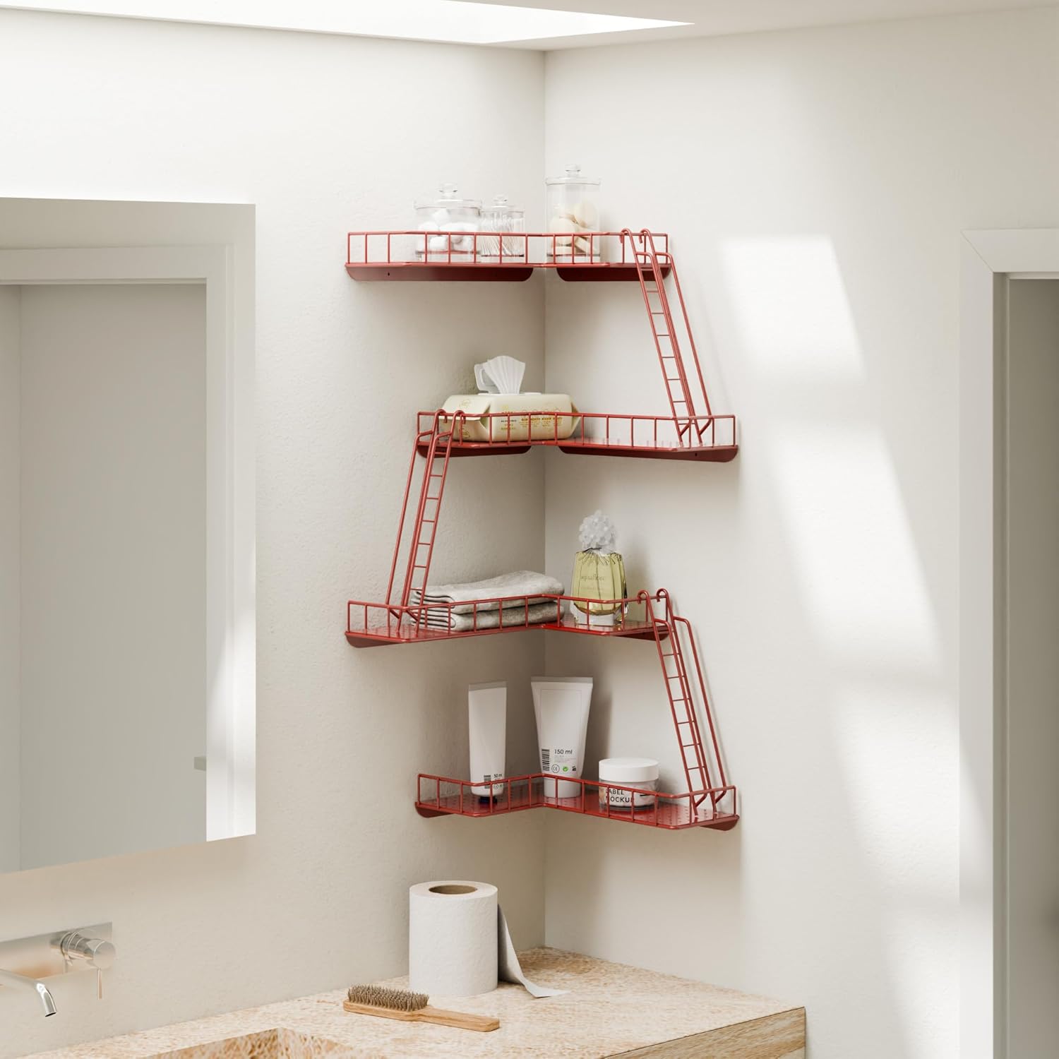 Fire Escape Wall Shelf - Modern City Style 4-Tier Corner Wall Shelves, Easy to Install Metal Ladder Shelf for Figures, New York Decorative Shelves for Bathroom, Living Room & Home Decor, Red