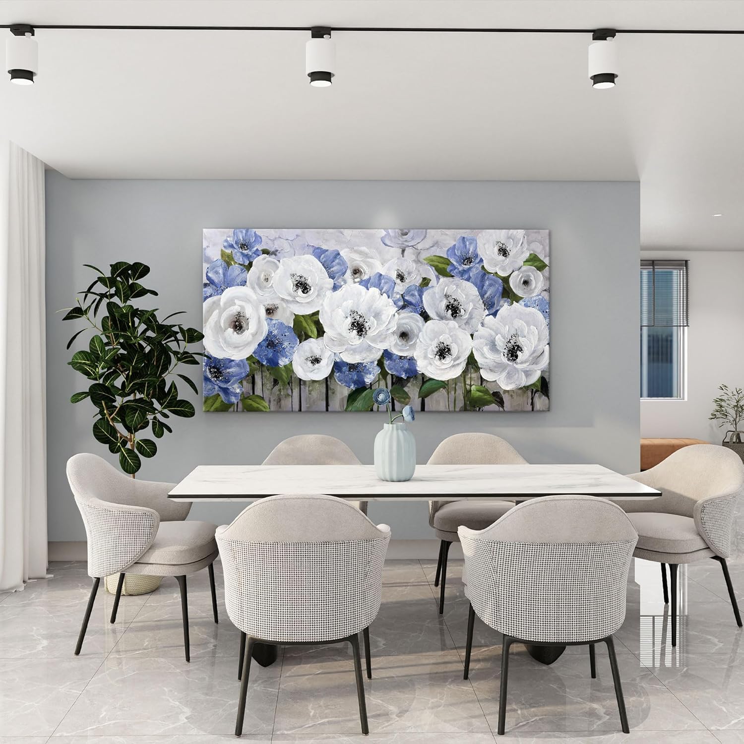 Floral Wall Art for Living Room- Large Canvas Paintings with Floral Wall Picture - Flower Wall Decor in Blue & White, Textured Artwork - Landscape Wall Art & Pictures for Bedroom and Home Decor