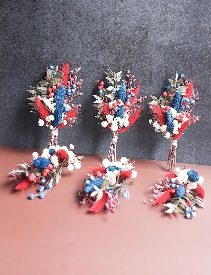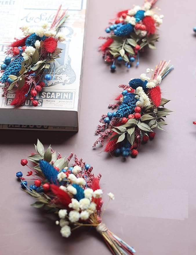 xin's convey Mini Dried Flower Bouquet 6 Piece Set, Burgundy Party Favours, Party Plate Decorations, Bridesmaids Flower Girl Proposal Boxes, Wall Decorations.(Blue + Burgundy)
