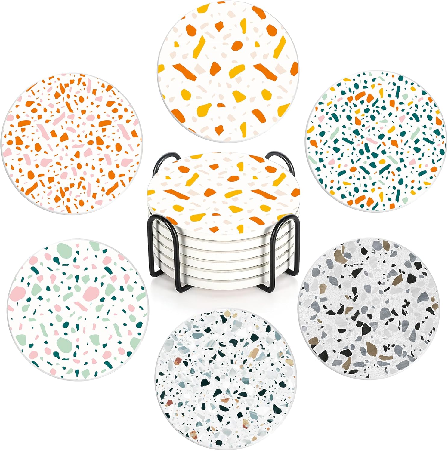 - COMPLETE SET:6 Cute coasters in Round Design, approx. 4 inch. Each coaster is a different pattern! And each set of coasters comes with a metal coaster holder for easy storage!