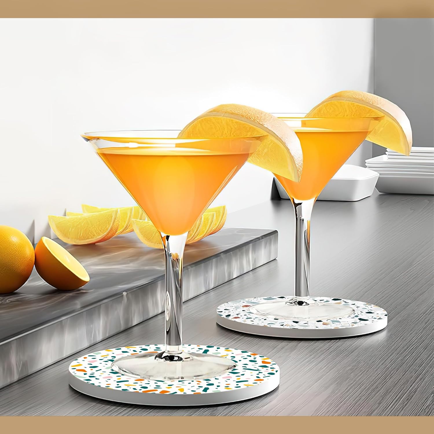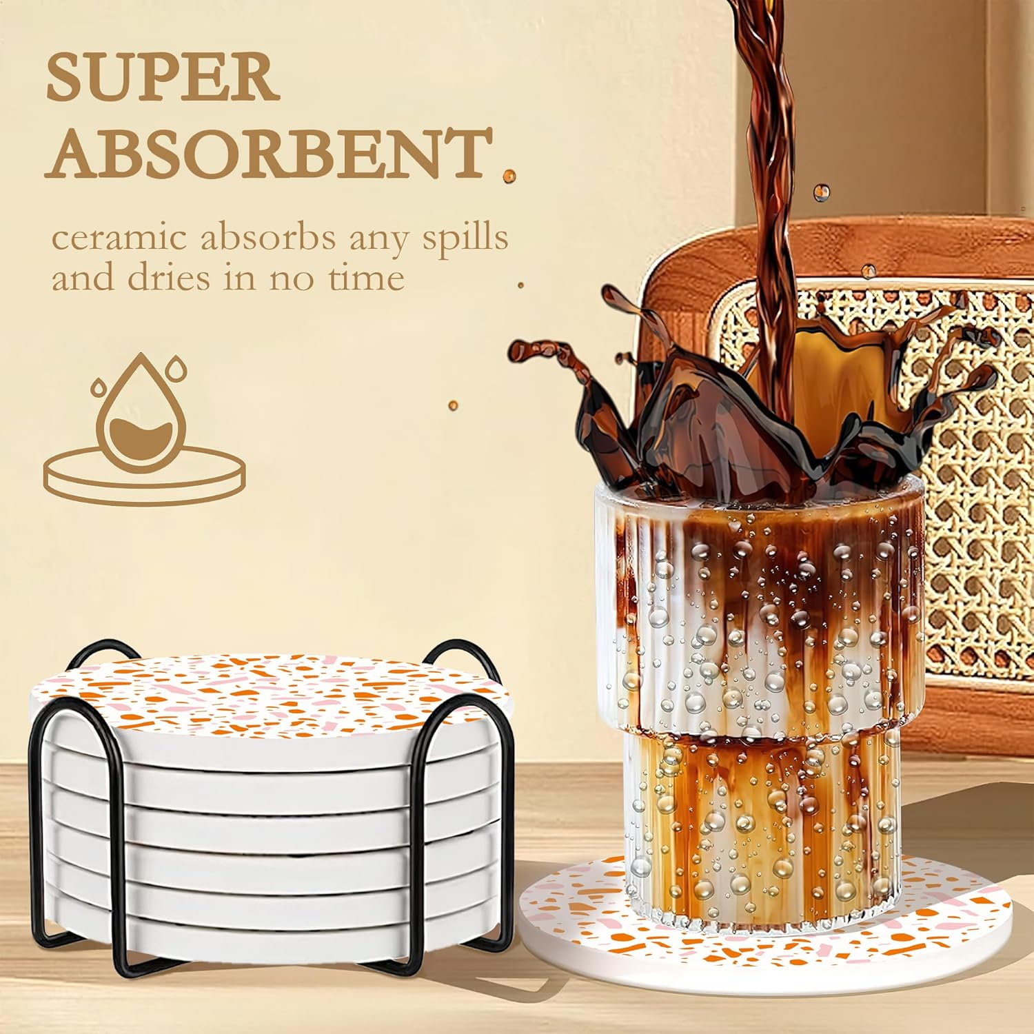 - CORK BOTTOM:The cork design of the coaster base prevents the ceramic from scratching your tabletop and increases the friction between the coaster and the tabletop with a non-slip effect.