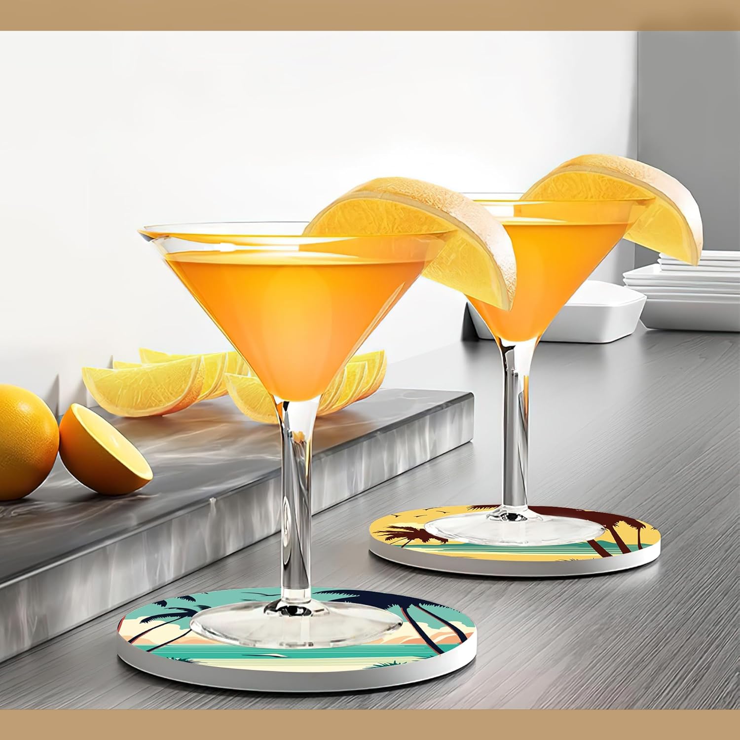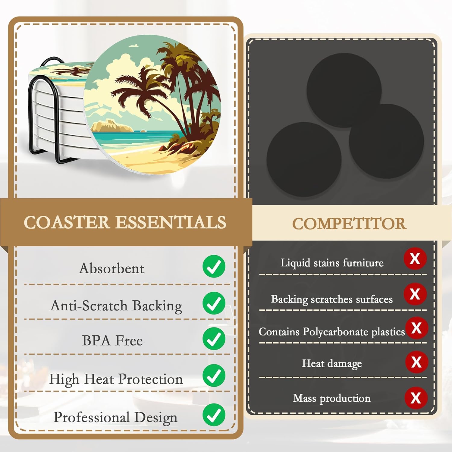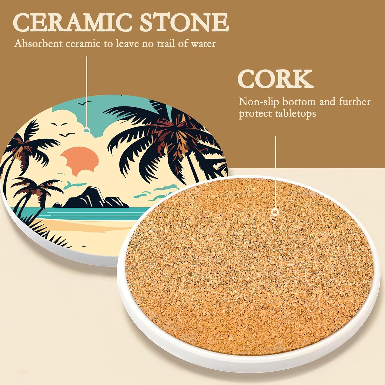 Drink Coasters with Holder,6 Pcs Palm Trees Beach Sunset Absorbent Ceramic Drink Pads, Non-Slip Table Protectors for Coffee & Glasses