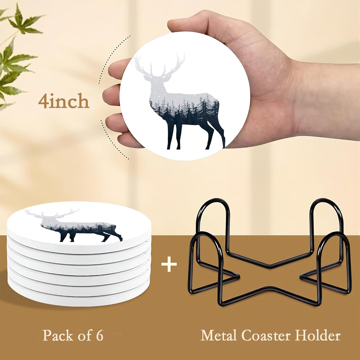 Drink Coasters with Holder,6 Pcs Deer Misty Forest Absorbent Ceramic Coasters with Cork Base,Cute Funny Table Drinks Coasters,Table Home Decor,4 Inches