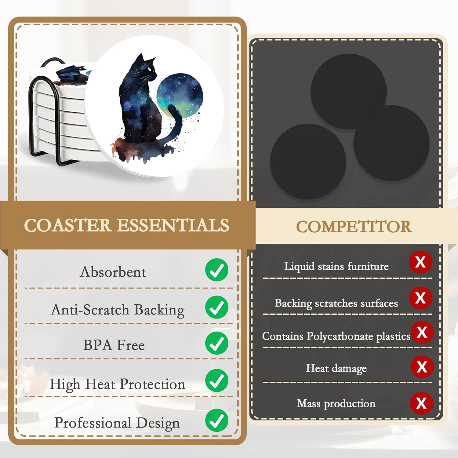 - CORK BOTTOM:The cork design of the coaster base prevents the ceramic from scratching your tabletop and increases the friction between the coaster and the tabletop with a non-slip effect.