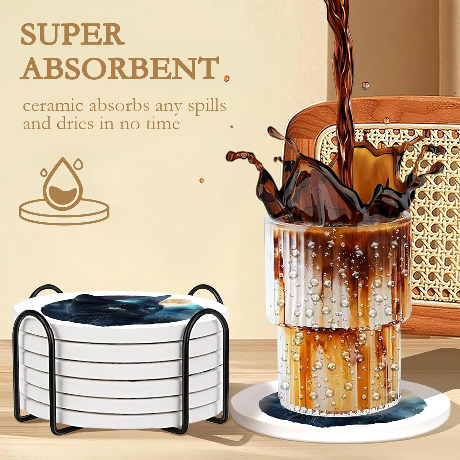 Drink Coasters with Holder,6 Pcs Black Cat Moon Coffee Cup Mat with Storage Holder, Durable Ceramic Coaster Set for Hot & Cold Beverages