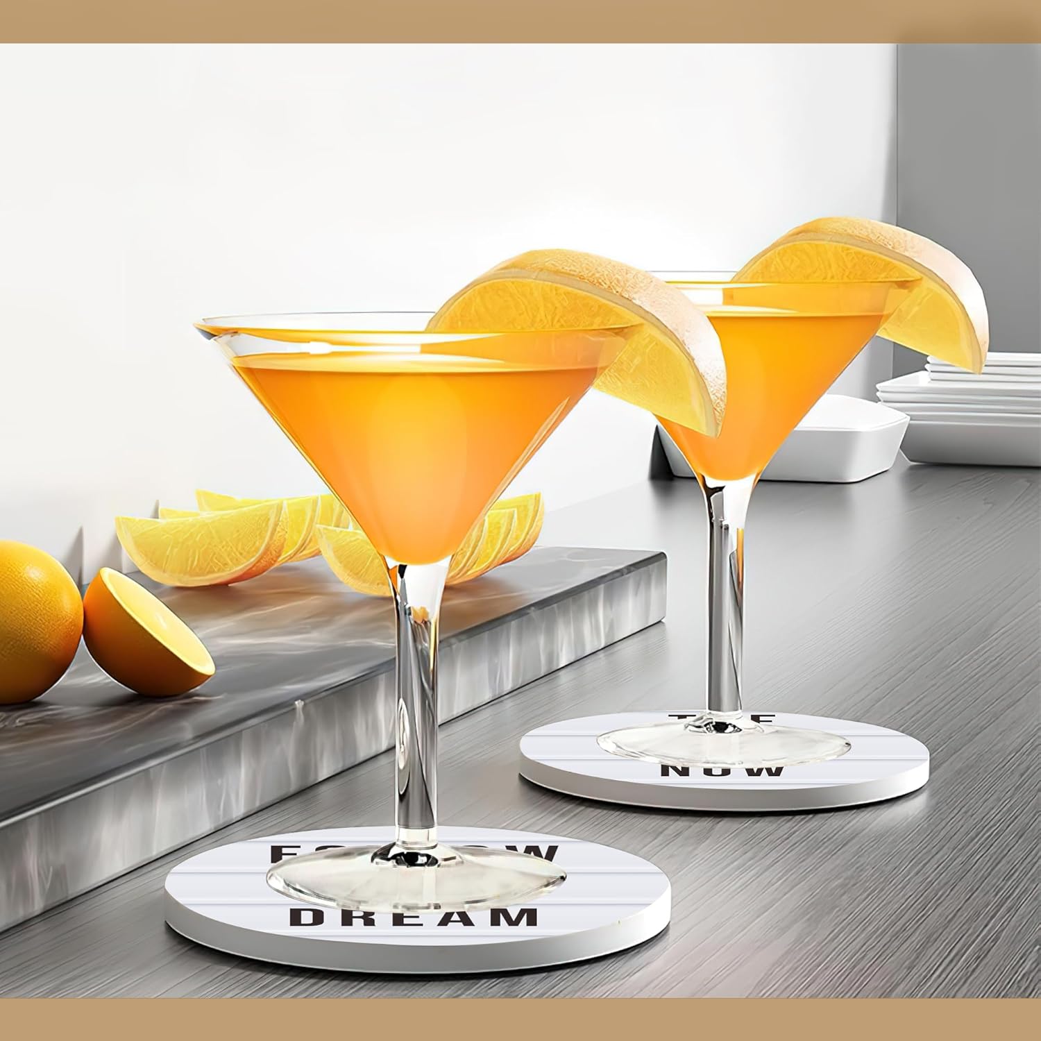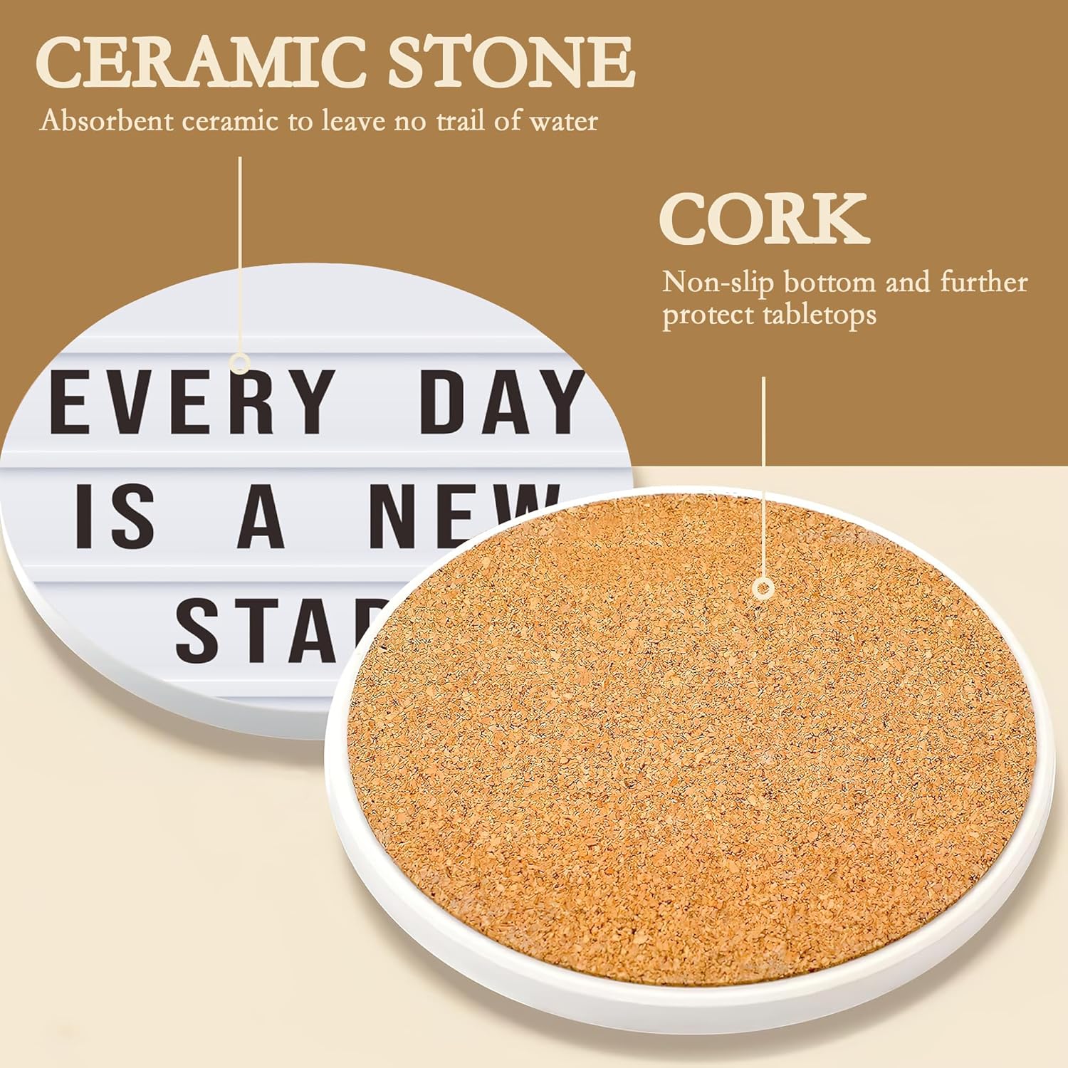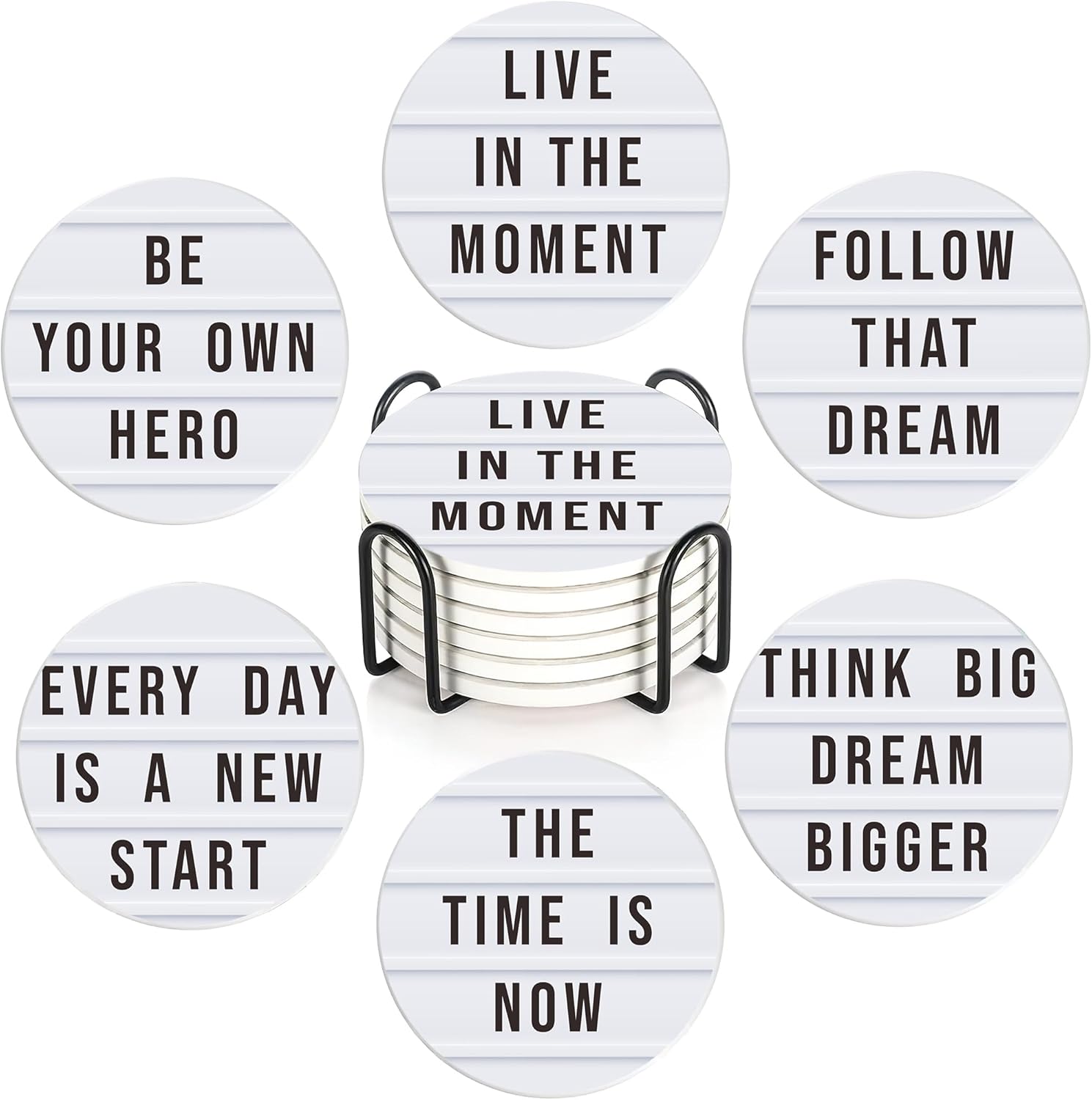 Coasters Set with Holder, 6 Pcs Motivation Quote Absorbent Ceramic Drink Pads, Non-Slip Table Protectors for Coffee & Glasses