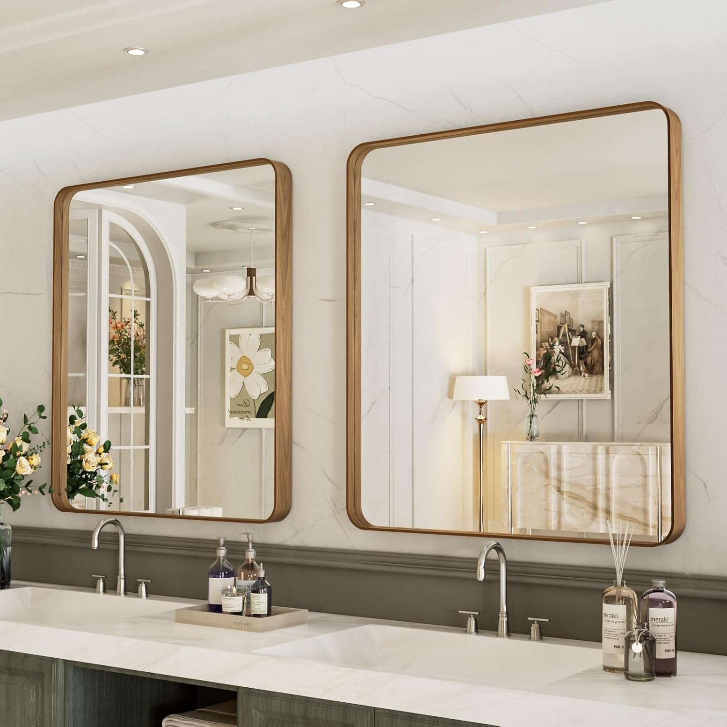 LOAAO 20X16 Inch Bathroom Mirror with Wood Grain Colored Metal Frame, Rounded Rectangle Metal Framed Bathroom Mirror, Anti-Rust, Hangs Horizontally or Vertically