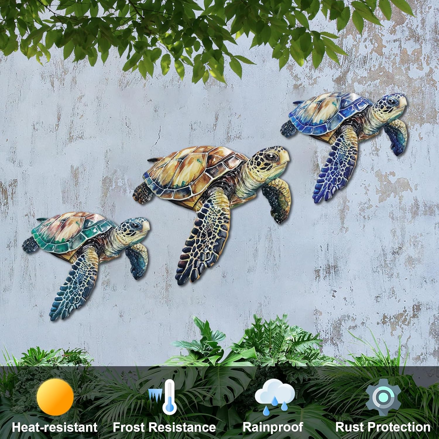 Metal Turtle Wall Decor Outdoor Turtle Coastal Ocean Sea Wall Art Sculptures Hanging Decorations for Bedroom, Living Room, Garden, Fence, Patio Set of 3