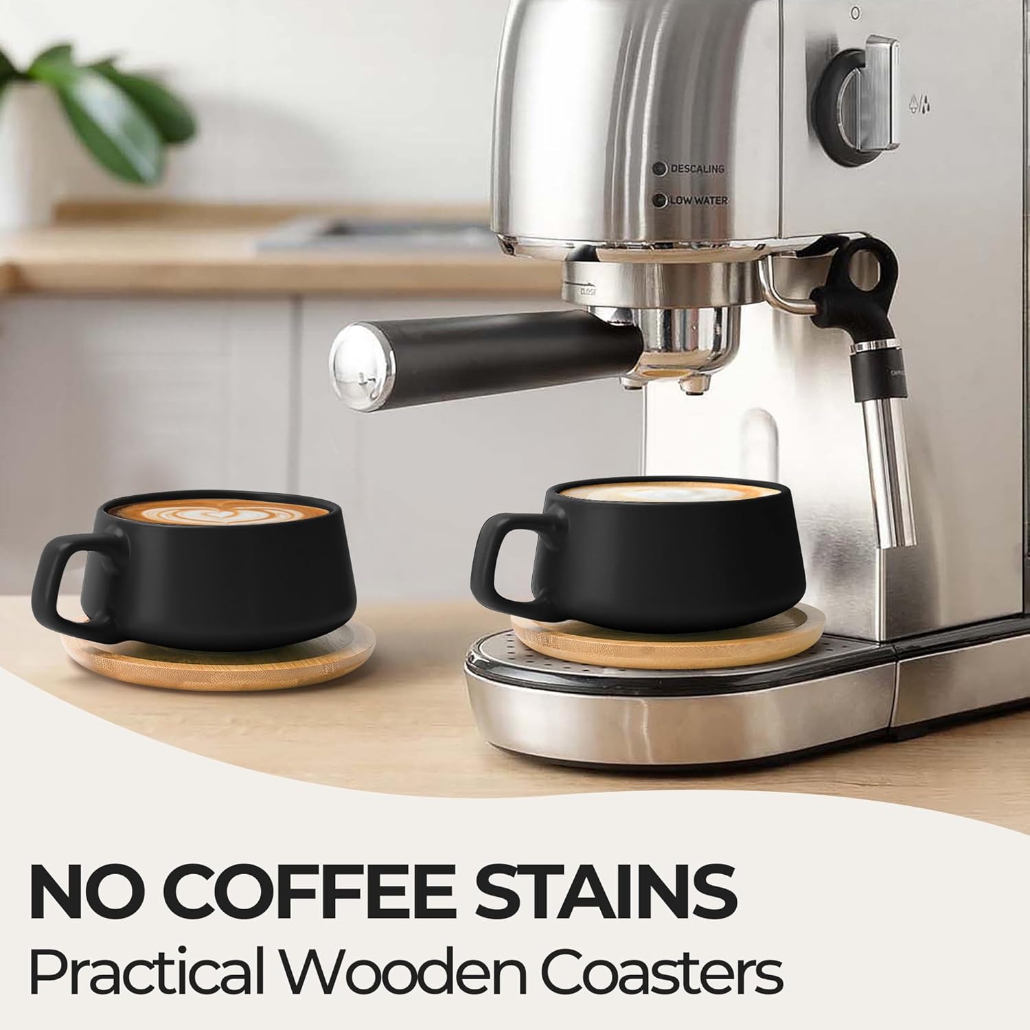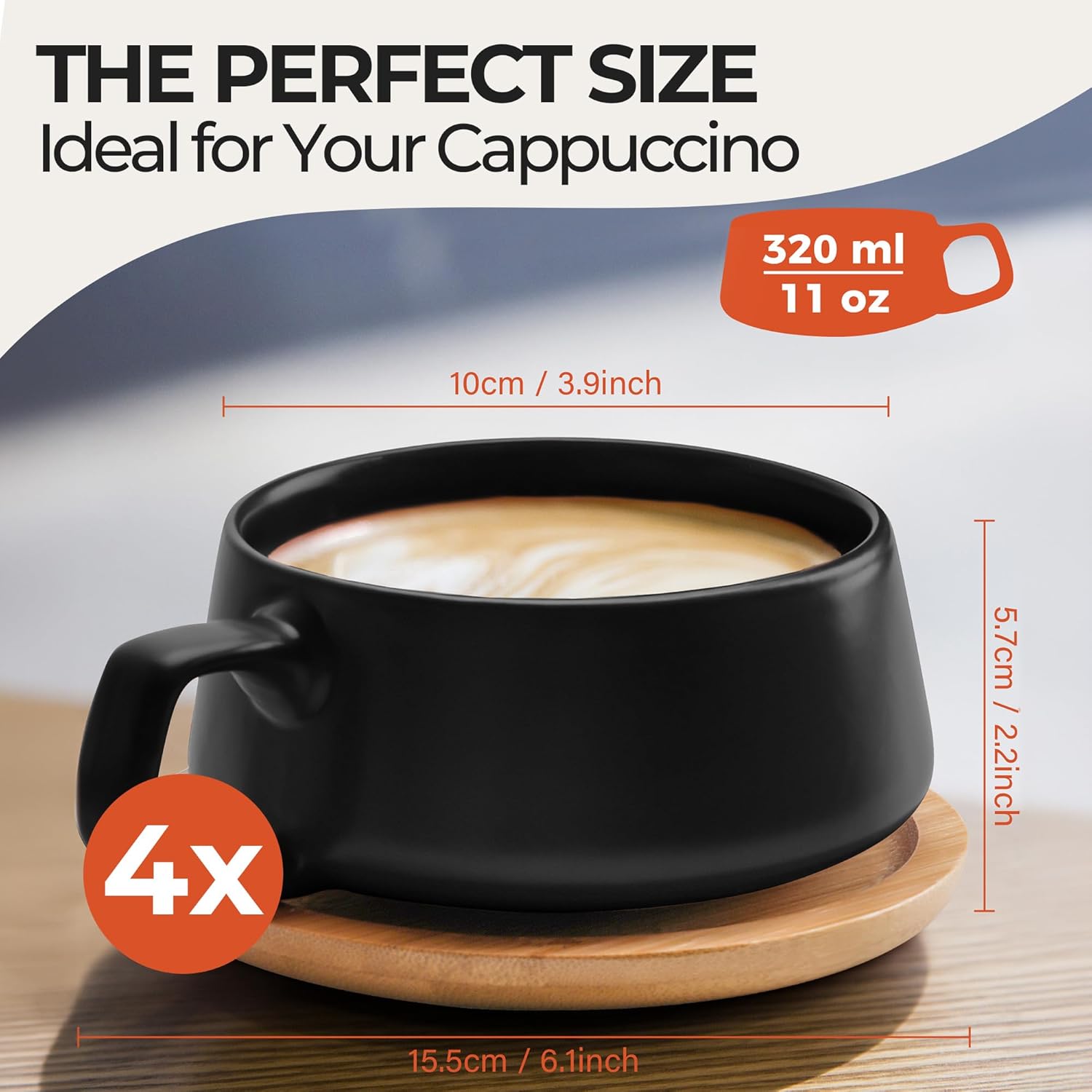 MIAMIO β 11 Oz., Set of 4 Ceramic Tea Cup and Saucer Bamboo/Tea Mug - Wide Cappuccino Cup, Coffee Cups Ceramic Mug for Cappuccino, Latte, Espresso & Americano - Luxe Collection (Black)