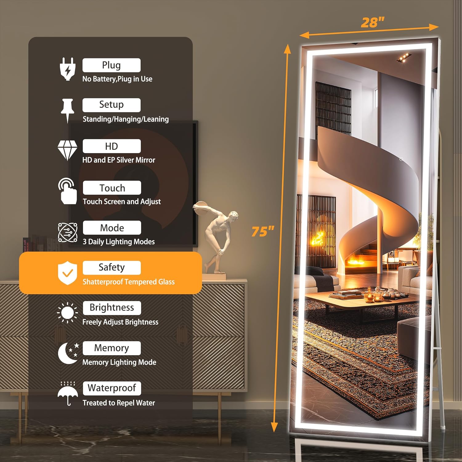 Hasipu Full Length Mirror with Lights, 75" x 28" LED Lighted Floor Standing, Full Body Dressing Hanging Mounted Mirror, Dimmable, Tempered Glass, Safe to Use, Square White